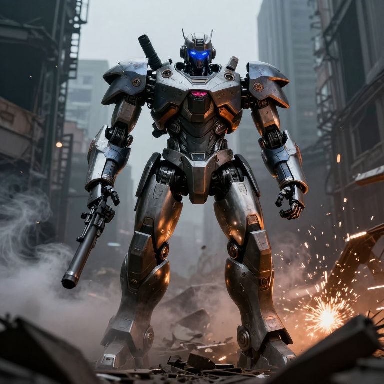 Ptw as a high-tech robot warrior standing in a ruined urban battlefield, sparks flying, smoke and debris all around, dramatic lighting highlighting advanced armor and weaponry, dark and intense mood with vivid metallic textures
