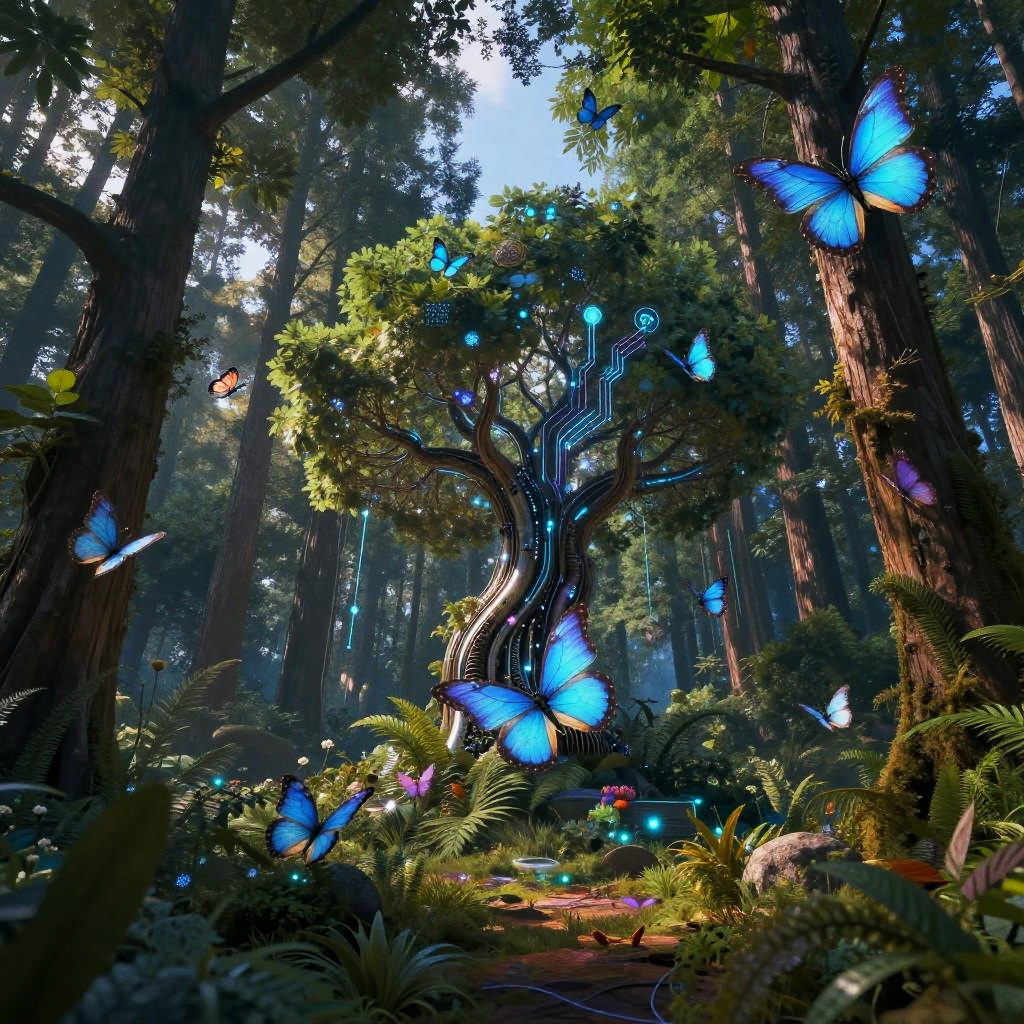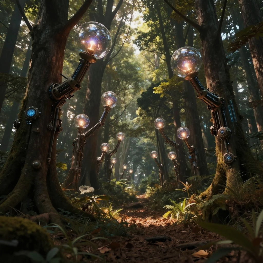 AI drawing a fantasy forest where trees have AI-powered glowing orbs and mechanical branches, blending nature and technology seamlessly, warm earthy tones contrasted with luminous electronic details, high detail environment creating a mystical yet futuristic scene.