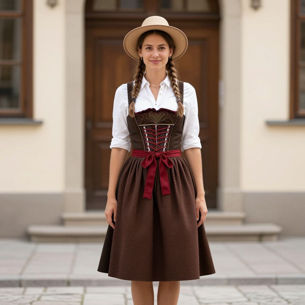 Traditional Oktoberfest Dress Costume, woman in brown dress and hat standing in front of a building
