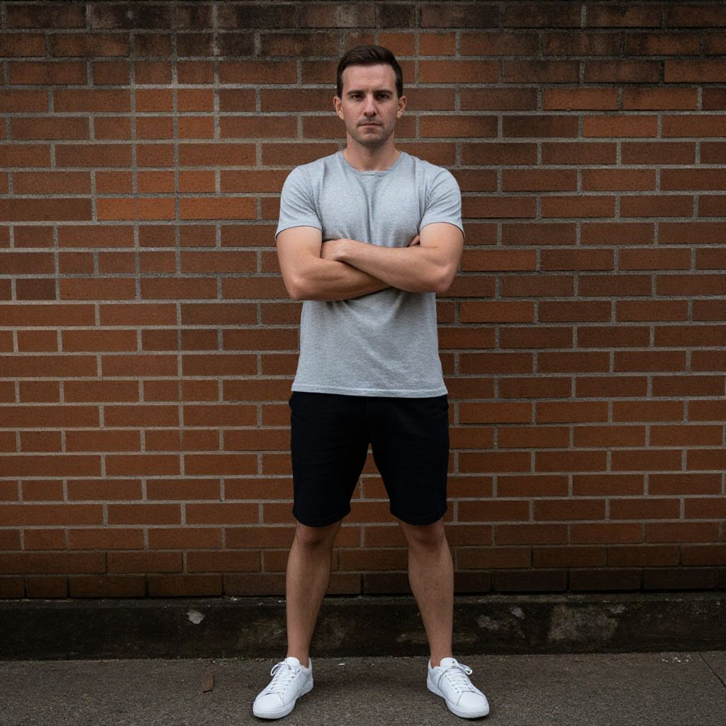 A man wearing a grey t-shirt, black shorts, and white sneakers is standing in front of a brick wall. He has a confident stance, with his arms crossed over his chest, exuding a sense of authority and calmness. The brick wall is weathered and slightly textured, adding a rugged element to the scene. The overall atmosphere is quiet and grounded, with the man's focused expression reflecting his determination and presence.