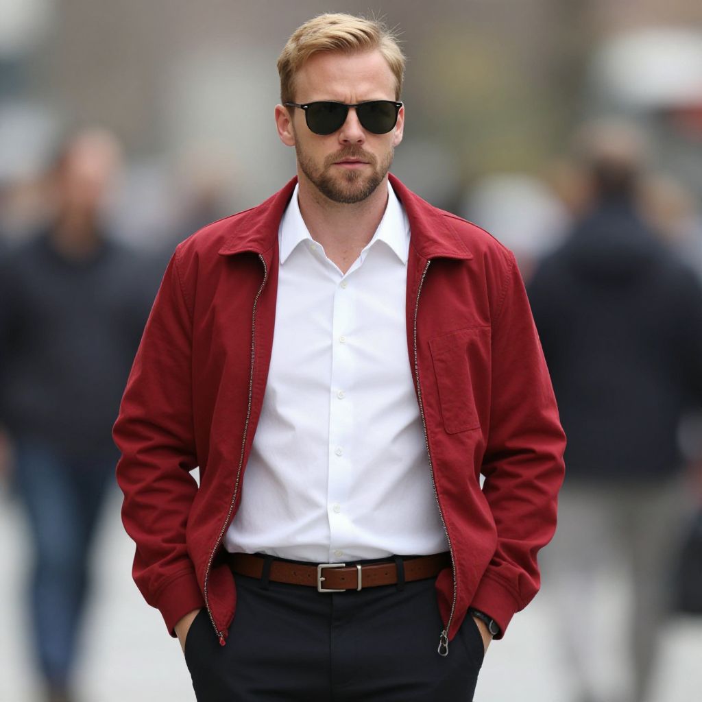 Ace ventura costume man, 1boy, male focus, shirt, sunglasses, jacket, belt, white shirt, pants, brown belt, collared shirt, solo, blurry background, hands in pockets, outdoors, facial hair, red jacket, blurry, blonde hair, open clothes, realistic, short hair, open jacket, black pants