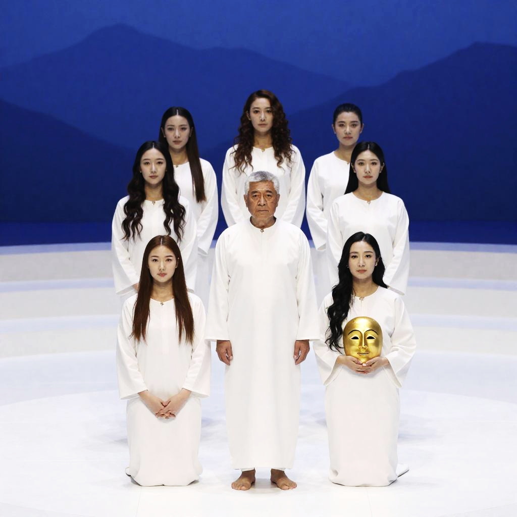 Photograph of a dance performance. Center: boy in blue pajamas walks forward. Surrounding: large crowd in casual clothes, predominantly red and blue, watching. Wooden floor, dim lighting, some people clapping. Audience on both sides, focused on the dancer.