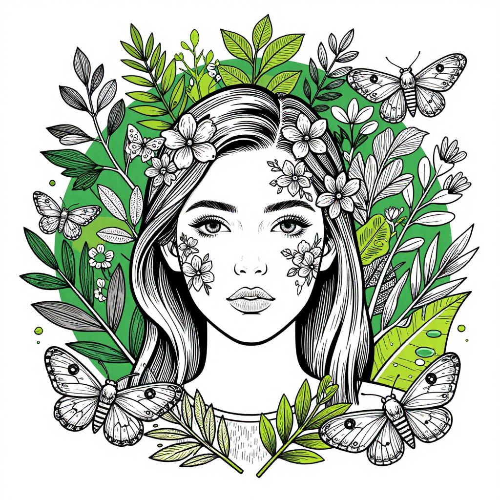 The image is a highly detailed, intricate 2D artwork featuring a female portrait in the style reminiscent of Banksy. The portrait is rendered with flat colors and line drawings, giving it a visual development and character design that resembles a coloring book page. The woman's face is adorned with delicate floral patterns, adding a natural and organic touch to her appearance. Surrounding her are various elements of foliage, including leaves and branches, creating a lush, verdant background. Moths, with their intricate wing patterns, are scattered throughout the image, adding a sense of movement and life. The overall composition is balanced, with the woman's face centrally positioned, flanked by the foliage and moths, creating a harmonious and visually engaging scene. The use of flat colors and line work gives the image a modern, graphic quality, while the floral and moth elements introduce a sense of nature and transformation.