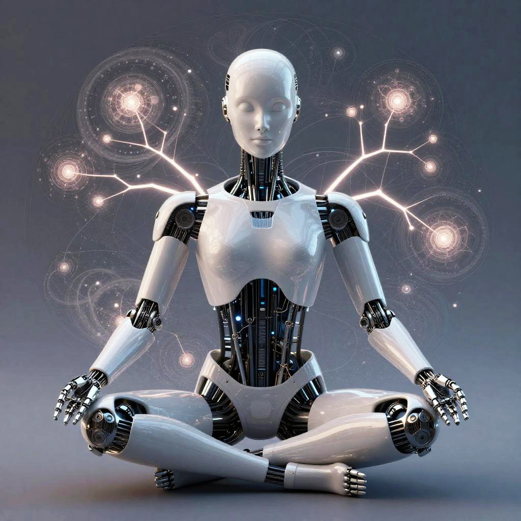AI gen art portraying a humanoid android meditating amid swirling fractal patterns and glowing neural networks, symbolizing the merging of consciousness and artificial intelligence in a peaceful, otherworldly setting.