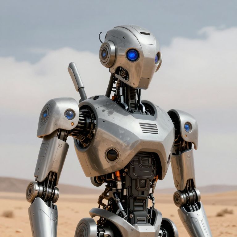 Photograph of a sleek, silver robotic humanoid with blue eyes, standing in a desert with a cloudy sky background.