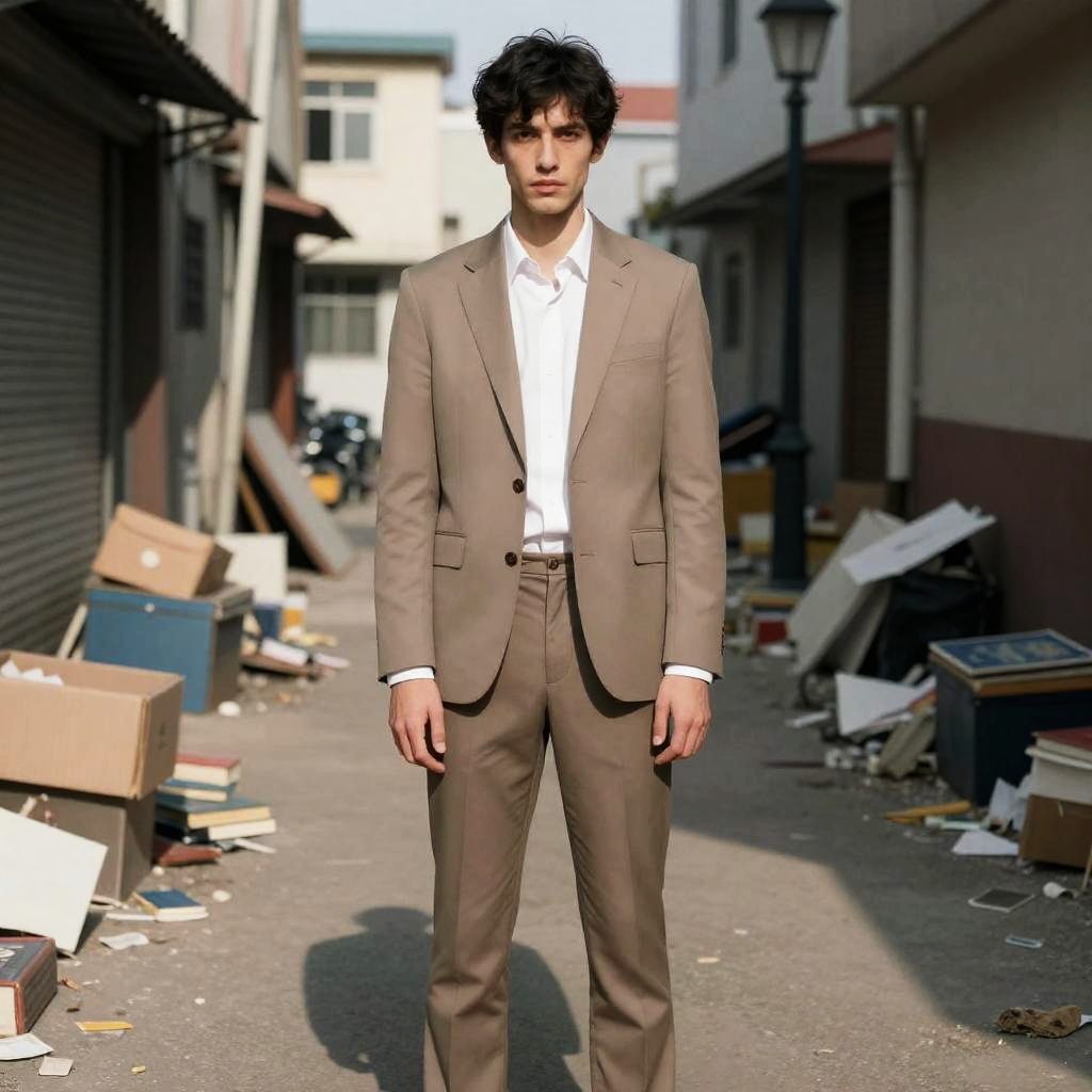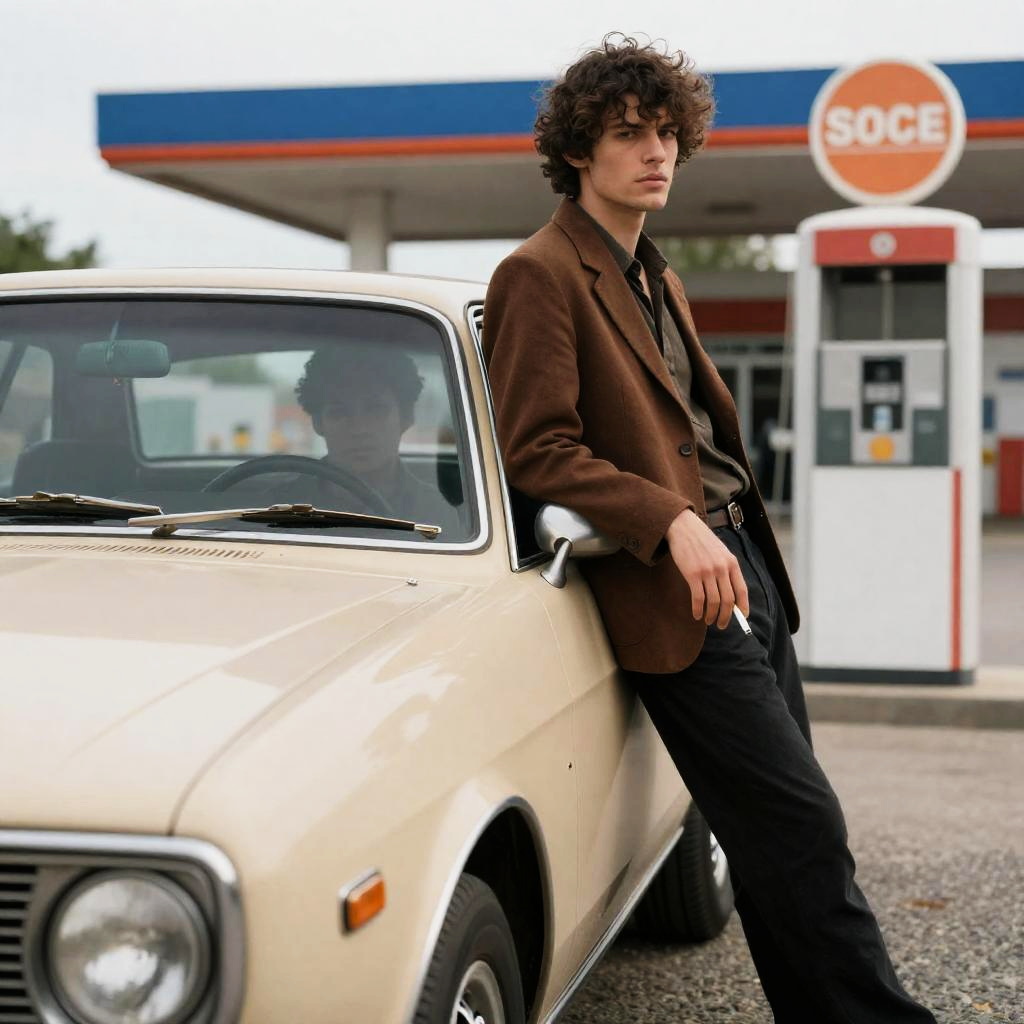 Man with curly hair, brown blazer, and dark pants leaning against a beige vintage car, holding a cigarette. Driver visible in car. Gas station with blue and orange signage in background. Gravel ground. Intense expression.