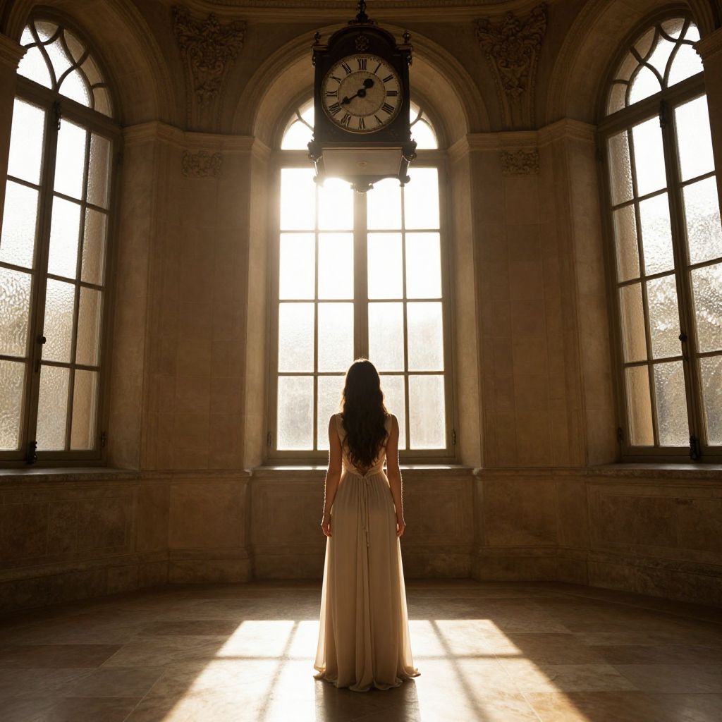 Sunlight streams through arched windows, casting golden rays across a grand hall as a woman in a flowing gown stands silhouetted against the warm glow, her long hair cascading down her back while an ancient clock with no hands hangs above, its shadow shifting subtly on the stone walls.