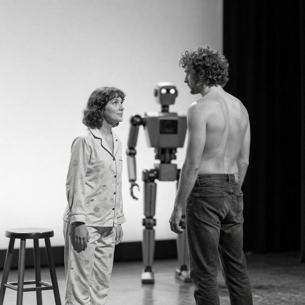 Black-and-white photograph of a stage performance. A shirtless man with curly hair and jeans faces a woman in patterned pajamas. A robot figure stands in the background. Bright light behind them contrasts with dark curtains. The man extends his arm, while the woman leans forward. A round stool is on the left.