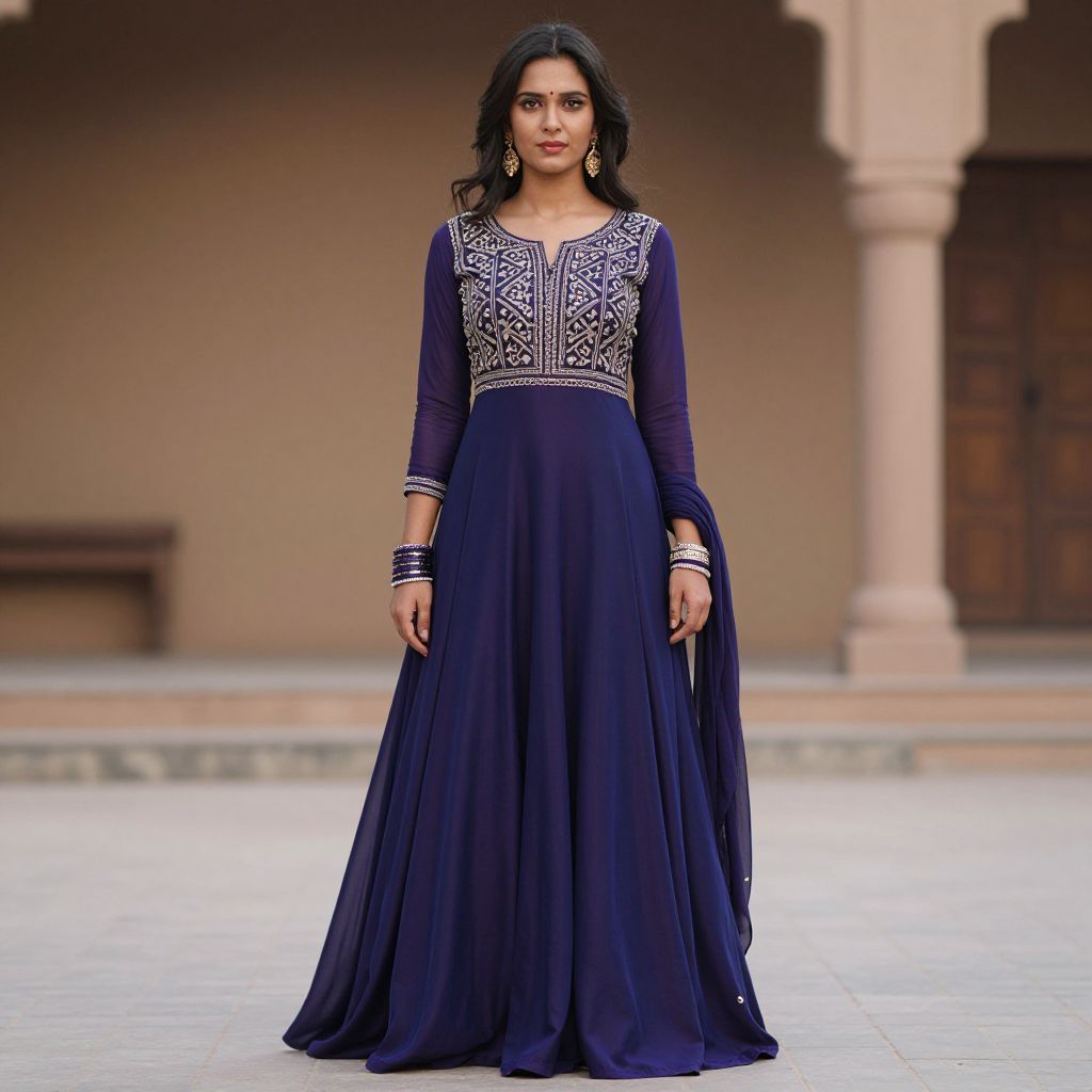 Photograph of an Indian woman standing on a stone-paved courtyard. She has dark, wavy hair and wears a long-sleeved, deep navy blue gown with an intricate silver embroidery pattern on the bodice. The gown has a flowing, floor-length skirt. She accessorizes with silver bangles on both wrists and small earrings. The background features a beige wall with arches and a wooden door. The lighting is natural, highlighting her serene expression and elegant attire. The overall style is traditional Indian fashion with a contemporary twist.