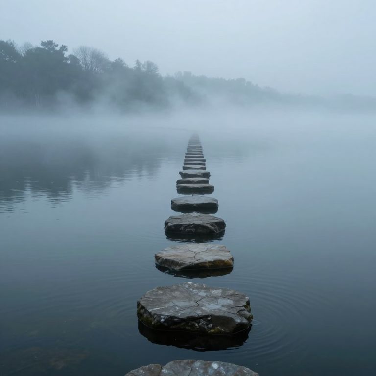 Photograph of a serene, misty lake with a stone stepping stone path leading into the foggy distance. The smooth, dark water reflects the overcast sky, while the large, weathered stones create a linear perspective. The mist blurs the background of leafless trees, adding a sense of tranquility and mystery. The stones are evenly spaced, with gentle ripples surrounding them, suggesting calmness. The overall color palette is cool, with shades of blue, gray, and muted green. The image emphasizes peacefulness and the natural beauty of the quiet, foggy lake.