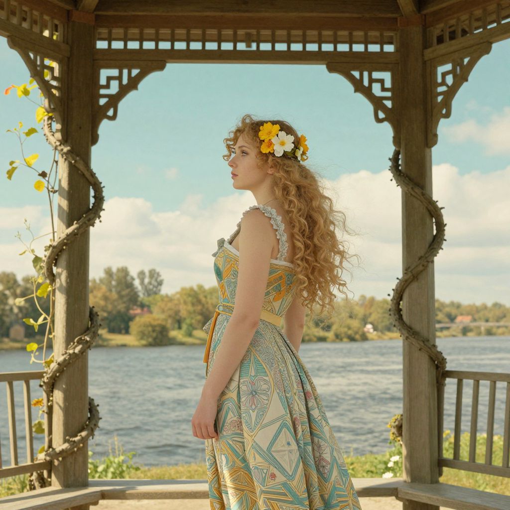 Photograph of a young woman with long, curly blonde hair adorned with yellow and white flowers, standing in a wooden gazebo with vine decorations. She wears a sleeveless, patterned dress in pastel colors with geometric designs. The gazebo is positioned by a river, with a clear blue sky and trees in the background. The woman faces left, showcasing her profile with a serene expression. The lighting is bright, emphasizing the natural beauty of the scene. The wooden gazebo has intricate, lattice-style detailing.