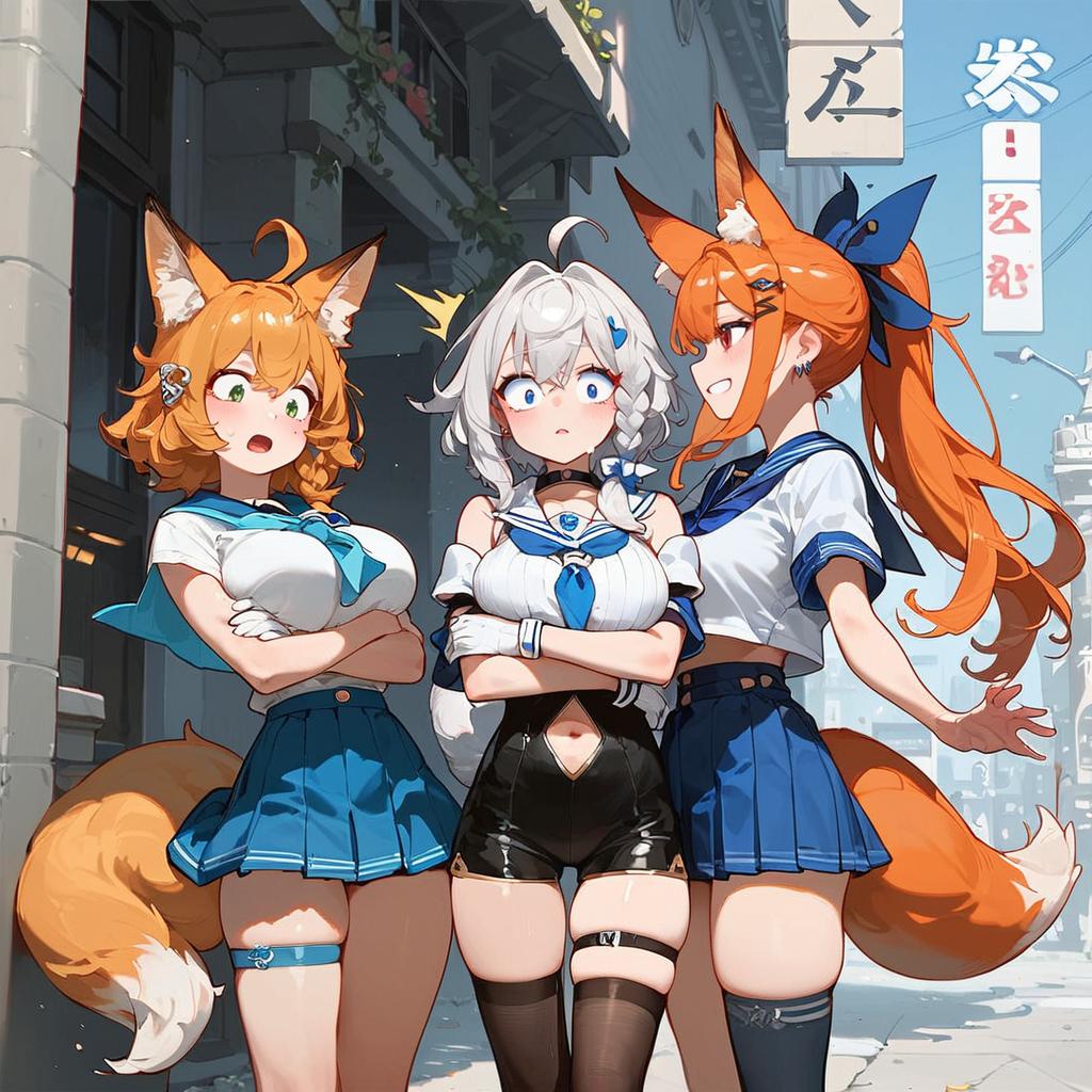 Score_9, score_8_up, score_7_up, source_anime, 3girls, street, (from side:0.5), ffchan, fox ears, blue bowtie, white shirt, serafuku, short sleeves, blue skirt, fox tail, orange hair, surprised, wide-eyed, looking to the side, fubukibase, white blouse, detached sleeves, black shorts, blue neckerchief, thigh strap, single thighhigh, white hair, single side braid, ahoge, piercing, pentagram, looking at another, ponytail, hair ribbon, black leotard, navel cutout, cape, white gloves, black thighhighs, large breasts, confident, grin, green, crossed arms