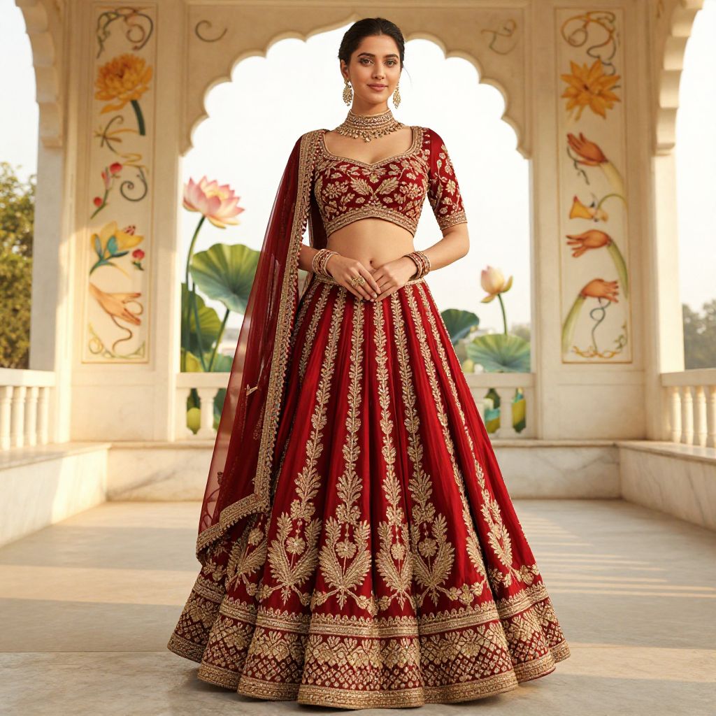 A high-resolution realistic photo of a graceful woman wearing an exquisite lehenga choli designer costume, featuring a deep red silk base with gold zari detailing, a floral choli with a high collar, and a wide, flared lehenga. She has fair skin, soft cheekbones, and a serene smile, standing elegantly on a marble pavilion under a golden afternoon sun, with lotus blossoms and hand-painted scroll art in the background.. The woman has big breasts and cute face