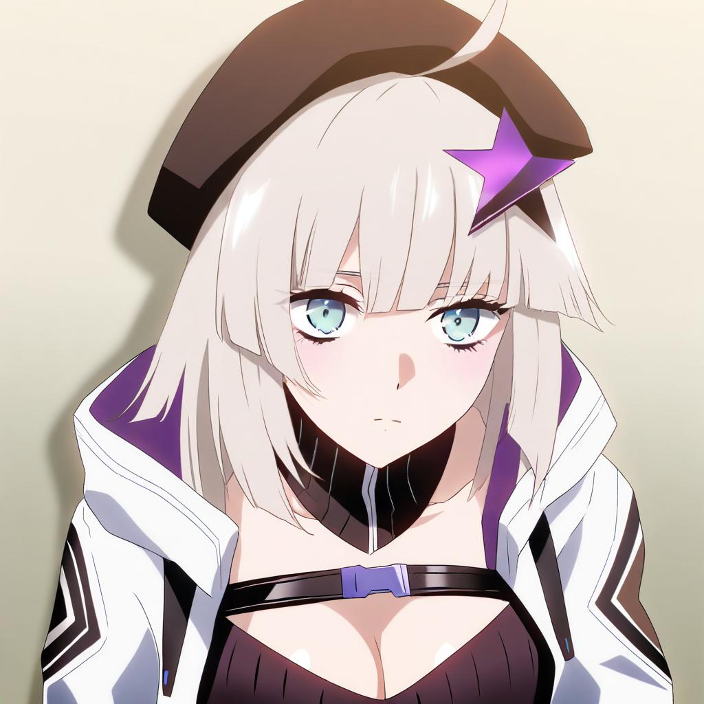 Aa-12 (girls' frontline), girls' frontline, 1girl, blue eyes, bags under eyes, long hair, grey hair, star hair ornament, ahoge, medium breasts, cleavage, black headwear, by artist hara (harayutaka), animagine