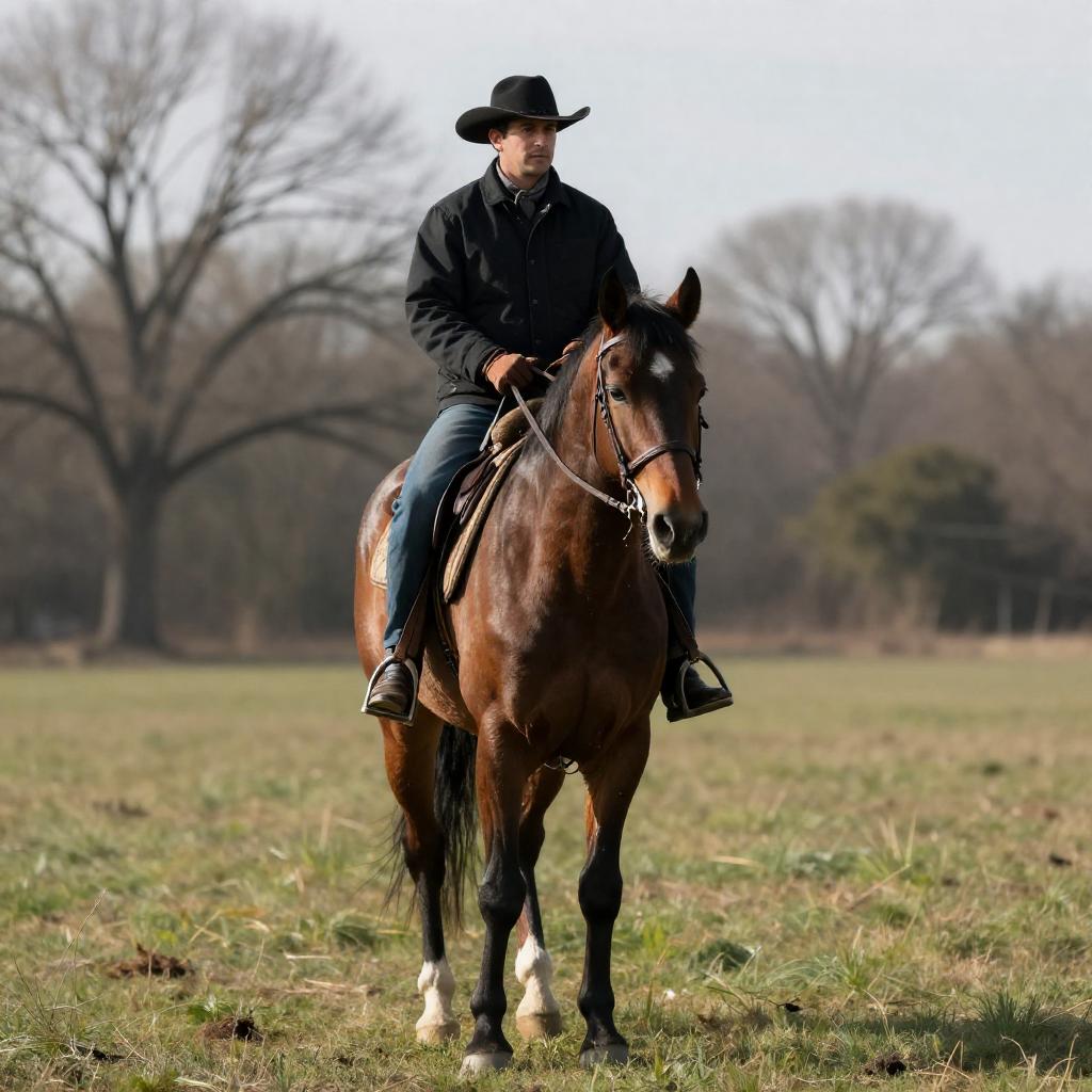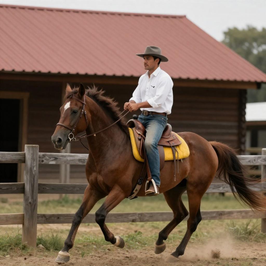 Photograph of a rodeo rider in a white shirt, black vest, and white cowboy hat, sitting confidently on a brown horse. He holds the reins with one hand and rests the other on his thigh. The horse is in a metal pen, with another person partially visible in the background. Trees and a blurred outdoor setting are in the background.