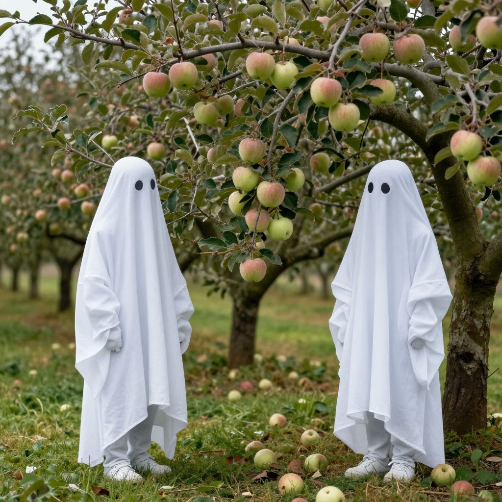 Photograph of two children dressed as white ghosts with black eye holes, standing in an apple orchard. They wear white hooded cloaks and white sneakers. The ghosts stand next to a tree laden with red and green apples. The grassy ground is dotted with fallen apples. The background shows rows of apple trees extending into the distance. The image has a whimsical, slightly eerie Halloween theme, with natural light enhancing the vibrant colors of the apples and the white cloaks contrasting against the greenery.