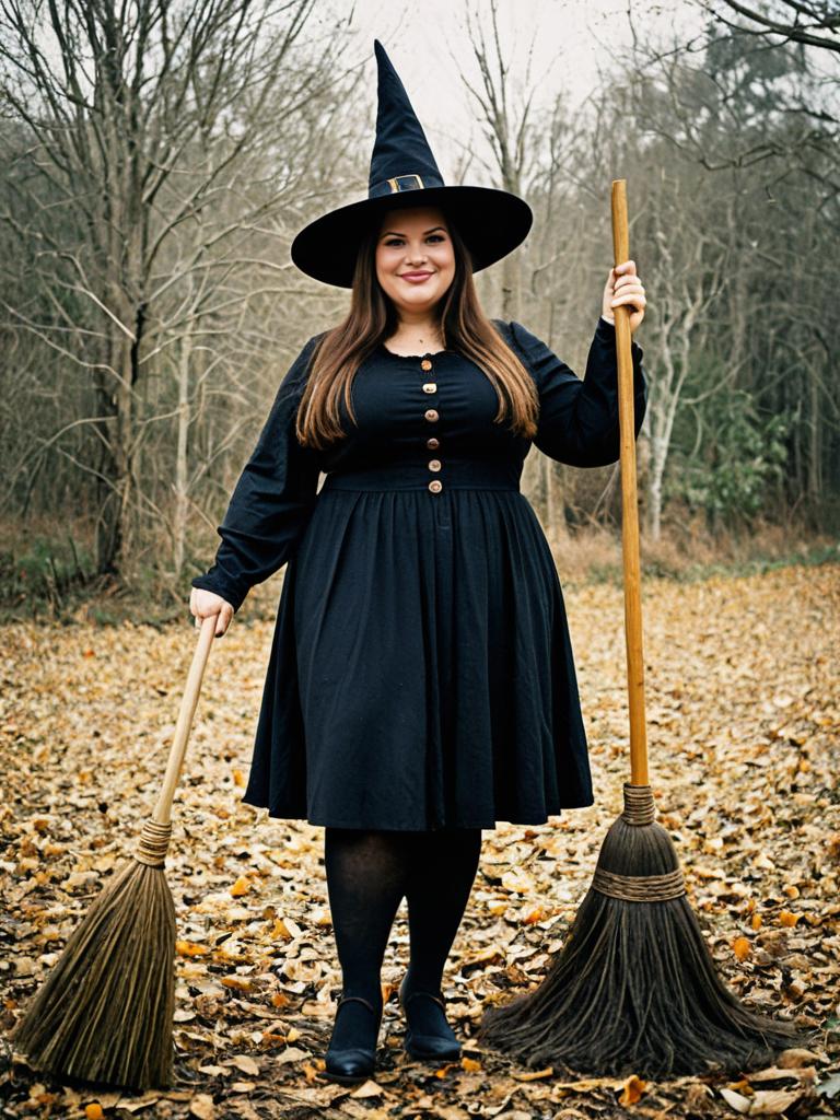 Woman plus size witch, 1girl, hat, witch hat, solo, broom, witch, brown hair, long hair, dress, pantyhose, full body, smile, standing, outdoors