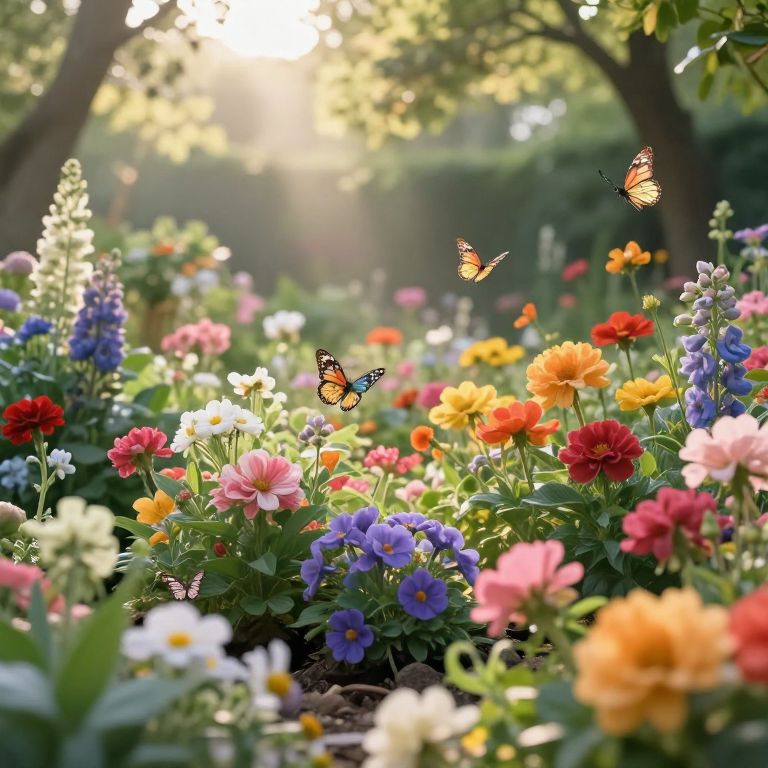 Photograph of a vibrant garden filled with colorful flowers, including red, pink, yellow, and blue blooms, under sunlight, with two orange and black