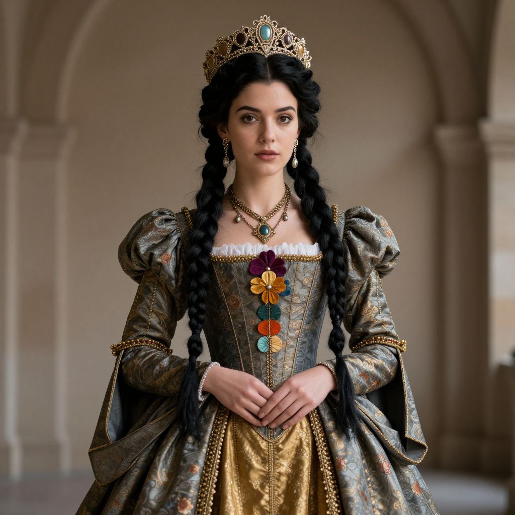 Photorealistic digital artwork of a young woman with pale skin and dark hair in two long braids, wearing a gold tiara. She has a regal, serious expression and is dressed in an elaborate, medieval-style gown with puffed, metallic silver sleeves and a gold, intricately patterned bodice adorned with colorful floral brooches. She wears a green gemstone necklace and has a white lace trim on her bodice. The background features a blurred, classical, arched hallway, adding a sense of grandeur to the scene. The overall style is detailed and realistic, emphasizing her royal status.