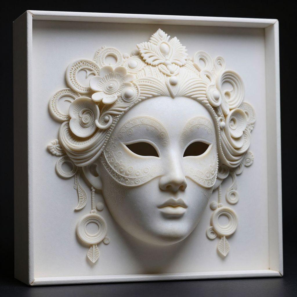 Photography of a venetian woman mask sculpted in white opalescent marble, with lots of thin ornaments, fractal art, intricate, 8 k, white box, cinematic light
