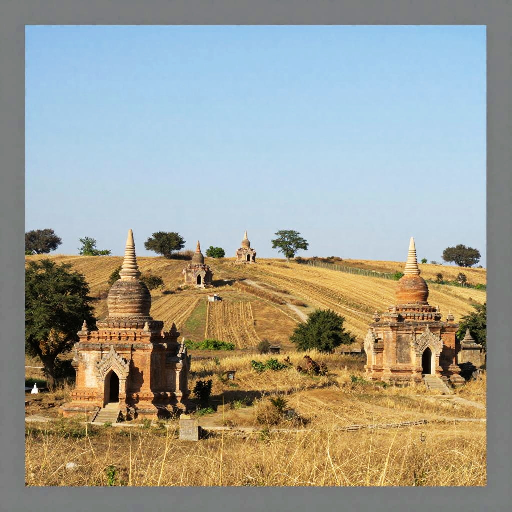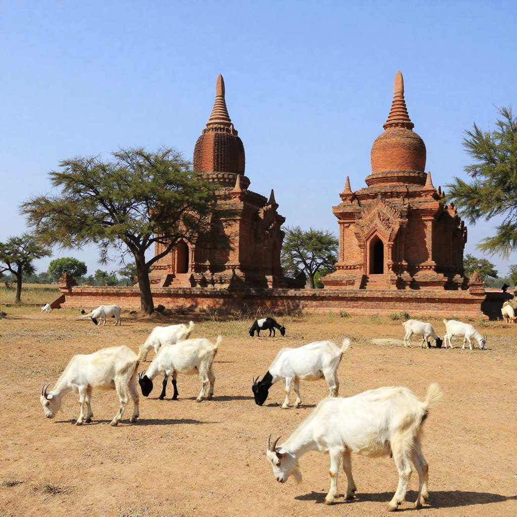 Sunlit Rural Goats and Ancient Pagodas