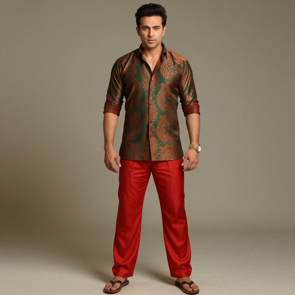 Bollywood Character Dress Up, man in a green and red shirt and red pants