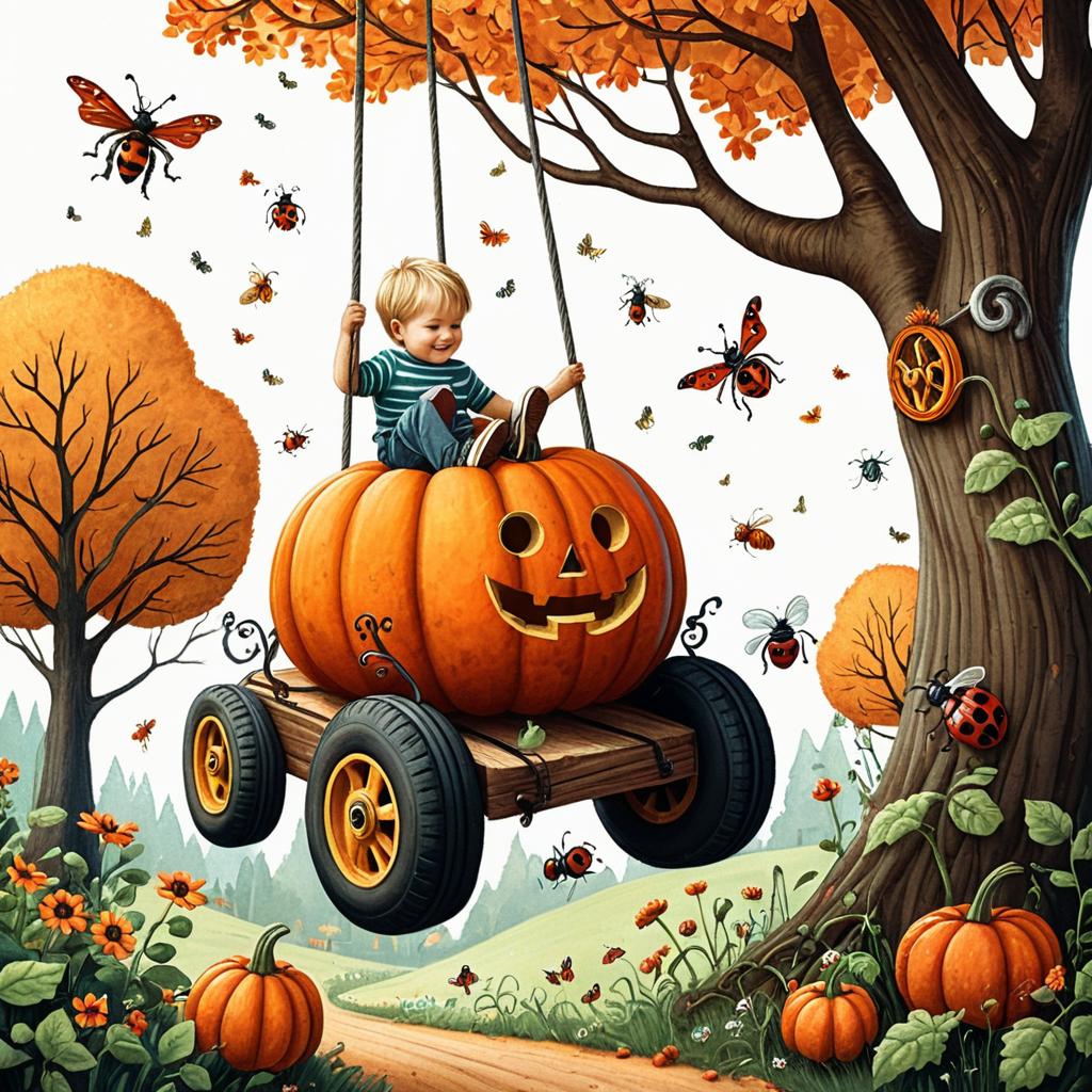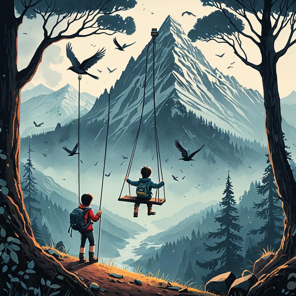 Create a book cover for a children's book called Journey Through Misty Mountains. The illustration features a towering misty mountain with branches representing flying robot birds and hovering drones. A curious child wearing hiking boots swings on a tire swing from the tree, symbolizing exploration and harmony between nature and technology. Rendered in a soft digital painting with cool, muted twilight tones. The title should be prominently displayed in handwritten, adventure-style font.