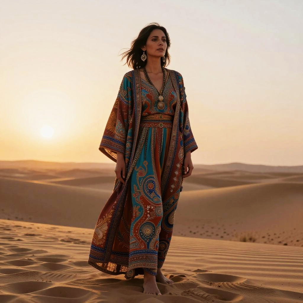 Photograph of a woman standing in a desert at sunset. She has wavy dark hair and wears a long, colorful, patterned dress with wide sleeves and a deep V-neck. Her large, circular earrings match the dress's intricate design. She's barefoot on the sandy dunes, with the sun low in the sky, casting a warm, golden glow over the scene.