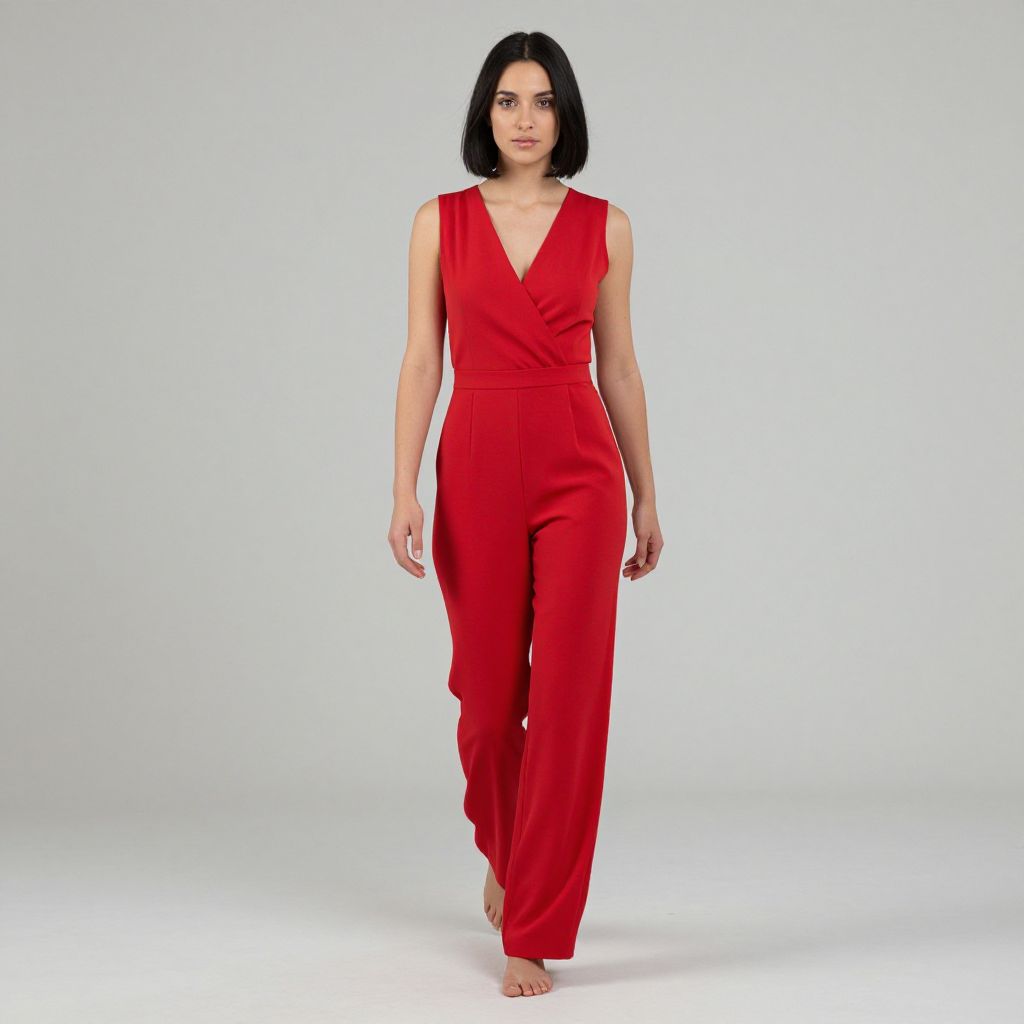Photograph of three South Asian individuals modeling red formal gowns on a plain gray background. The central figure, a man with short, dark hair, wears a long-sleeve, V-neck red gown with a jeweled necklace, standing with a neutral expression. To his left, a woman with long, dark hair in a low ponytail wears a one-shoulder red gown, looking slightly to the side. In the background, another woman with similar features and hairstyle wears a red jumpsuit-style gown, standing with her hands by her sides. All wear simple, elegant jewelry, and the gowns have a smooth, flowing texture.