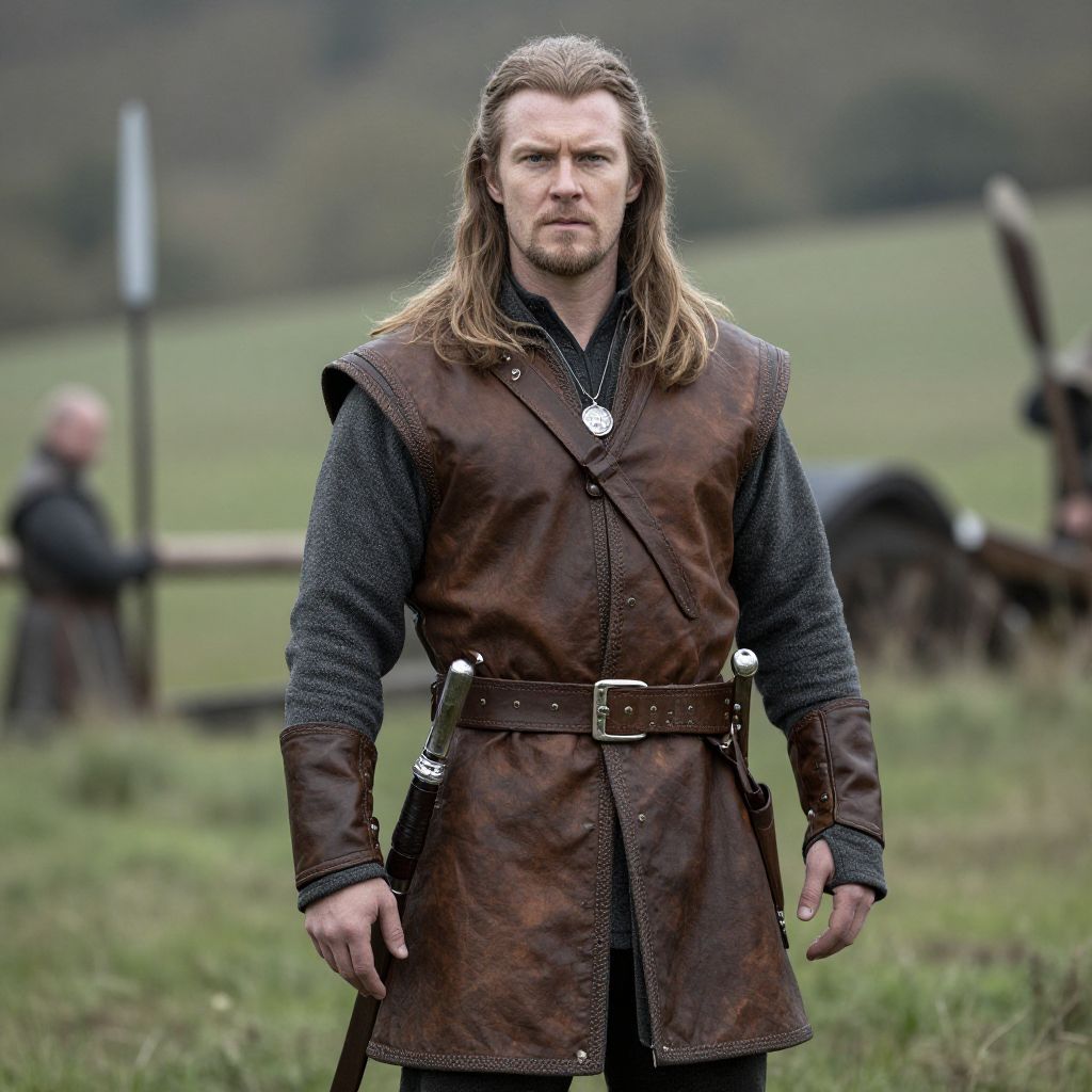 Photograph of a serious, long-haired man in medieval brown leather tunic with belt, black wool shirt, standing in grassy field. Blurred