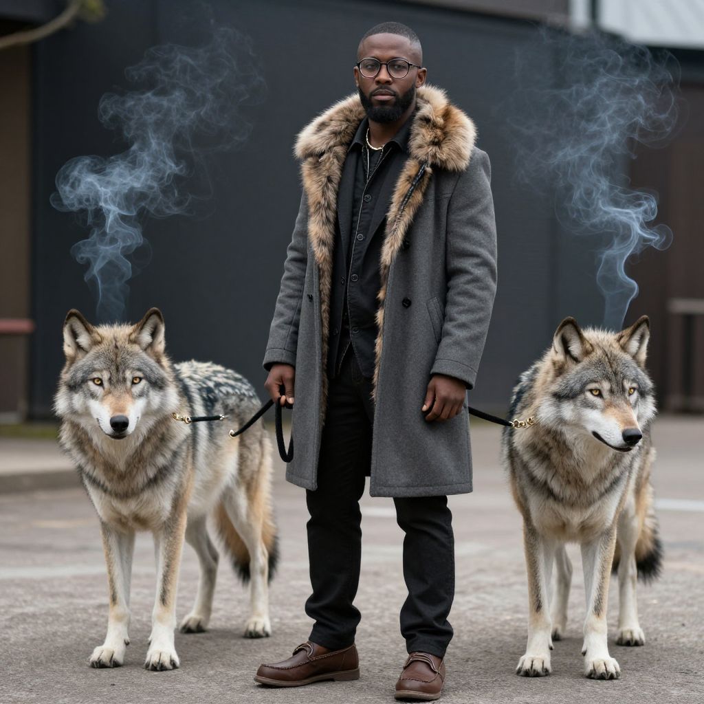 Photograph of a tall, muscular Black man with a short beard and glasses, wearing a long, dark gray overcoat with a fur-trimmed hood, black shirt, and dark pants. He stands in an urban setting, holding leashes attached to two large, wolf-like dogs with smoky breath visible. The dogs have thick, multi-colored fur and intense expressions. The background is blurred, showing a dark building and a gray pavement. The man's brown shoes are polished, and he wears a gold chain necklace. The image has a realistic, high-contrast style with vivid colors and sharp details.