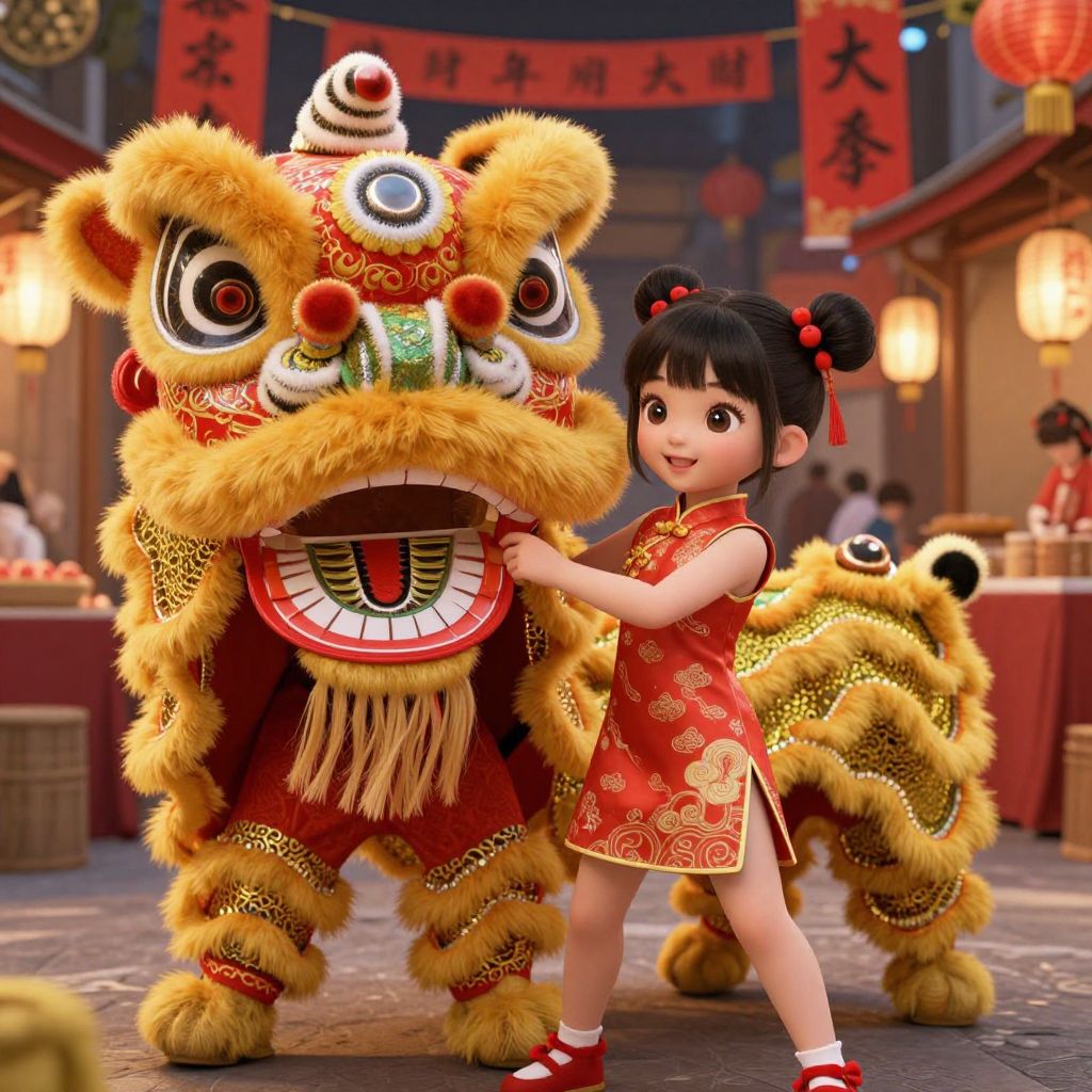 Festive Chinese New Year anime scene depicting a young girl in an elegant qipao playing with a friendly lion dance costume, set against a backdrop of bustling market stalls and red banners, warm lighting and intricate details highlighting cultural motifs and joyful celebration.