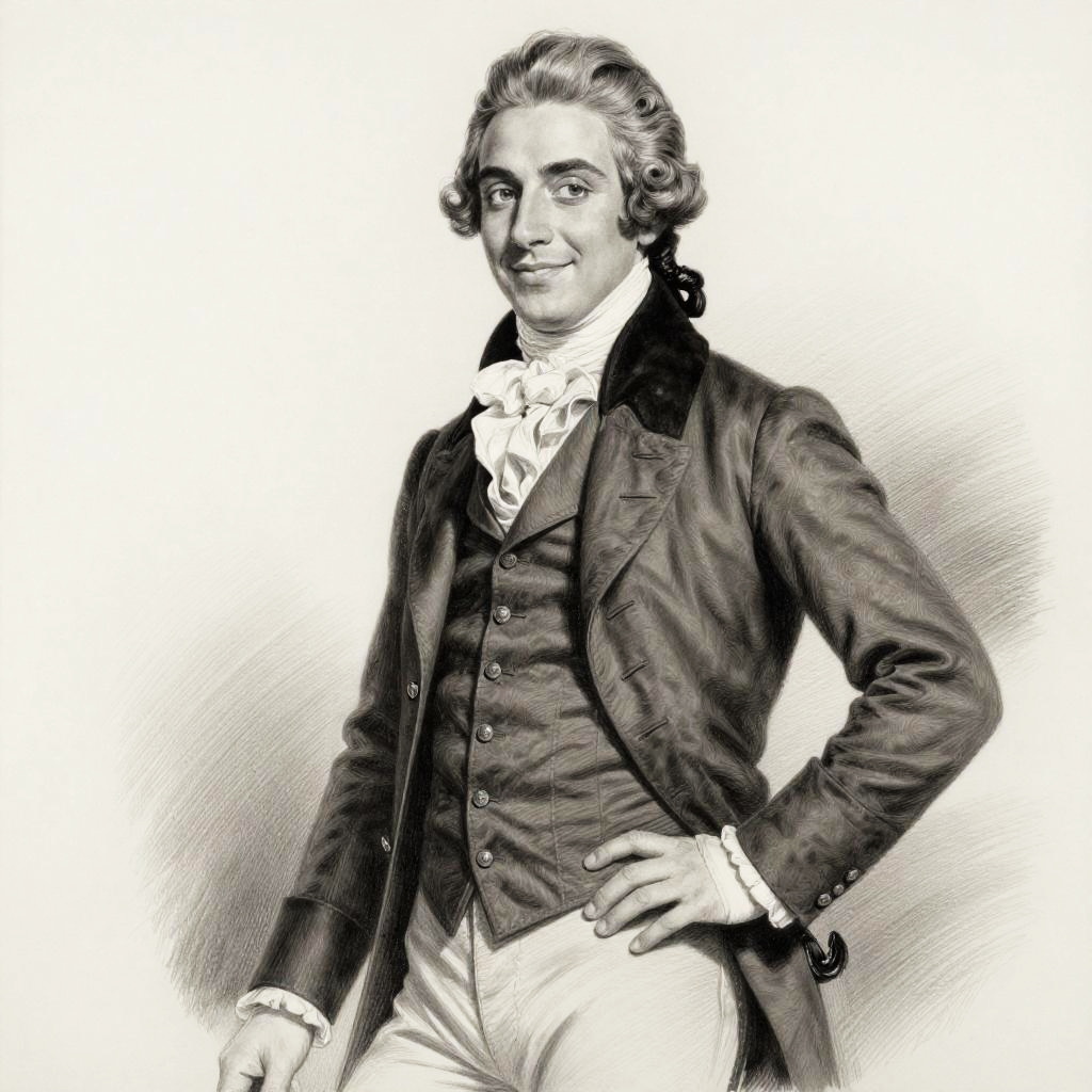Realistic photo.Elegant pencil portrait by Jean-Auguste-Dominique Ingres depicting a dashing young lord, with a confident posture, tailored suit, and charming smile, in stylish and sophisticated, flawlessly drawn realistic photo