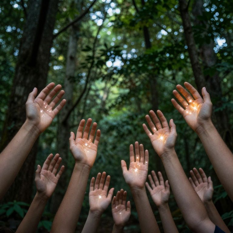Photograph of several outstretched hands in a forest, illuminated by glowing fairy-like lights. The hands, of varying skin tones and sizes, are raised towards the sky, creating a sense of wonder and magic. The background is a dense, lush forest with tall trees and green foliage, with sunlight filtering through the leaves. The glowing lights are small, white, and scattered across the hands, adding a mystical element. The image has a dreamy, ethereal quality, emphasizing the contrast between the natural forest and the magical lights.