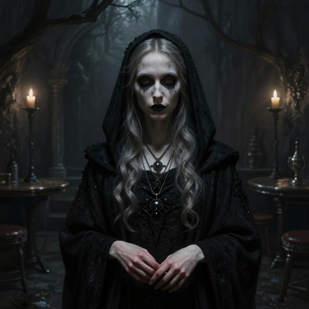 Gothic-style photograph of a pale woman with dark makeup, long wavy hair, black veil, and cloak, standing in a dimly lit