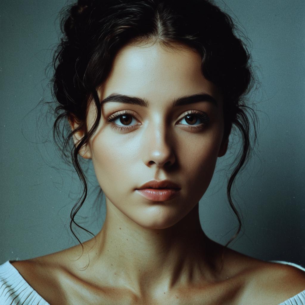 Ultra-realistic close-up portrait of a young woman with serene expression, detailed facial features, and contrast lighting. The subject has dark curly hair styled loosely, bare shoulders with an off-shoulder white top, and soft natural makeup highlighting her detailed eyes and smooth skin.