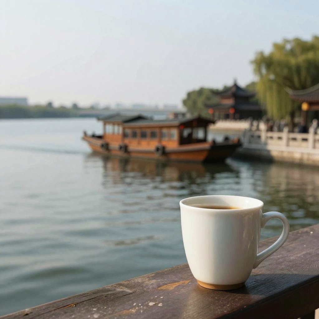 No humans, watercraft, water, scenery, outdoors, boat, blurry, photo background, blurry background, cup, depth of field, day, traditional media, sunlight, river, sky, ocean, pier, reflection, dock, realistic, ship, tree