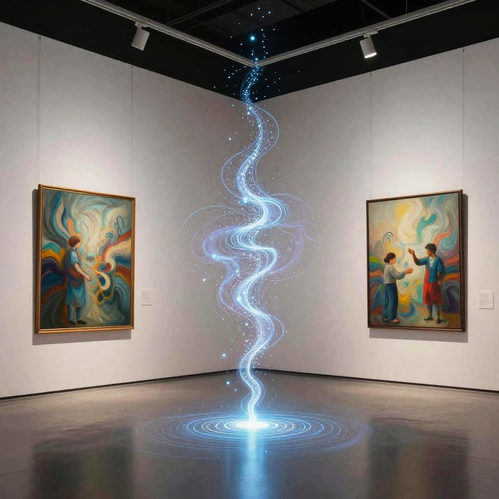 Photograph of a modern art gallery with three vibrant, abstract paintings featuring swirling colors and dynamic patterns, hanging on white walls under black ceiling lights.