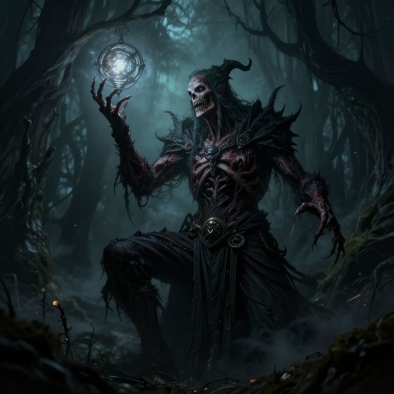 Lich concept art of a forsaken sorcerer rising in a haunted forest, skeletal fingers clutching an enchanted orb emitting ominous light, rotting flesh and mystical decay details, twisted trees and dark mist background, highly detailed fantasy horror style, dynamic composition and shadows.