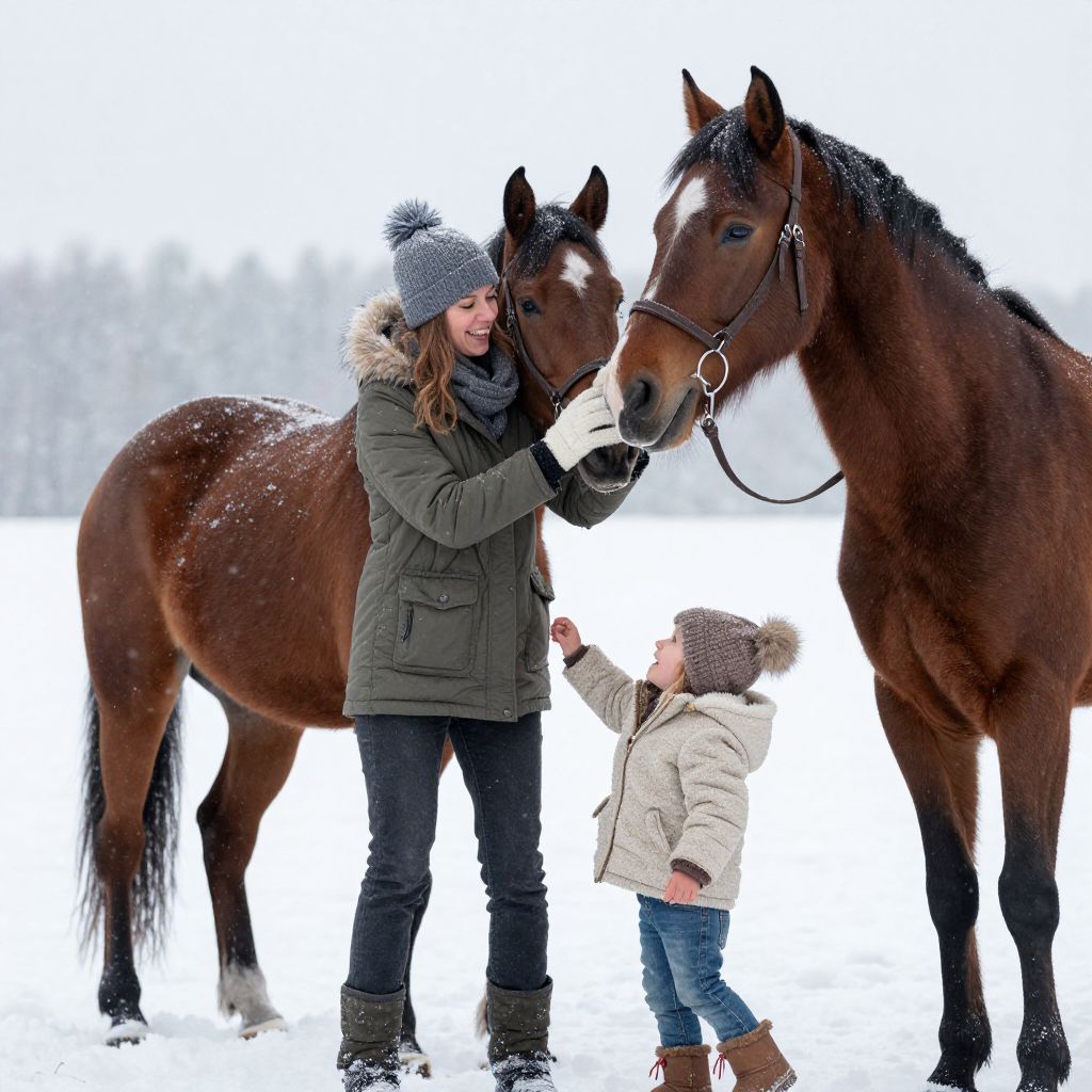 Photograph of a woman and a child standing in a snowy landscape, petting two large, brown horses. The woman, with long brown hair, wears a gray beanie, olive-green parka with fur hood, black pants, and white gloves. The child, with light brown hair, wears a beige hooded jacket, blue jeans, and brown boots. Both horses have dark manes and tails, with snowflakes on their bodies. The background is a bright, overexposed white, suggesting heavy snowfall. The woman gently touches the horse's nose, while the child reaches out with his right hand. The scene exudes warmth and affection amidst the cold, snowy environment.
