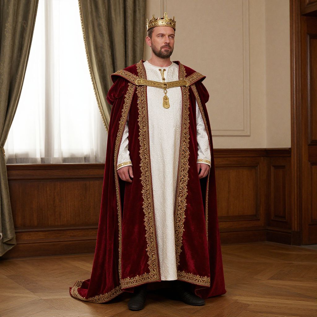 Photograph of a bearded man in a royal robe, gold crown, and white embroidered tunic, standing in a wooden-paneled room with green