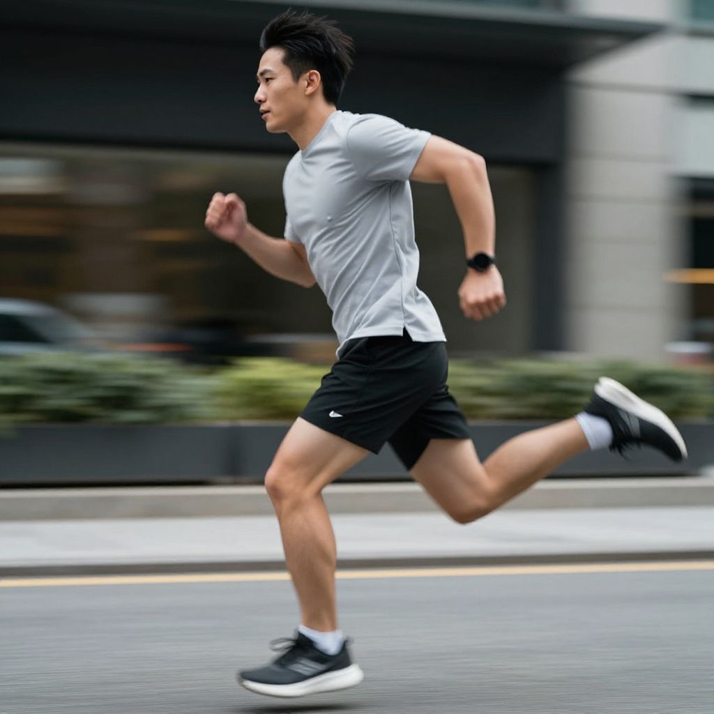 Photograph of a bearded man with dark hair, wearing a black long-sleeve shirt and black pants, jogging on a blurred city street with