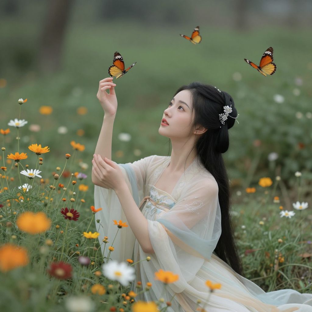 Photograph of an East Asian woman with long, dark brown hair adorned with small white flowers, wearing a white, sheer, short-sleeved dress. She is kneeling in a vibrant meadow filled with orange, yellow, and purple wildflowers, reaching up with both hands to gently touch a black and orange butterfly. The background is softly blurred, showcasing more wildflowers and greenery. The woman's expression is gentle and focused, highlighting a serene, natural moment. The image has a soft, dreamy quality, with bright and contrasting colors enhancing the beauty of the scene.