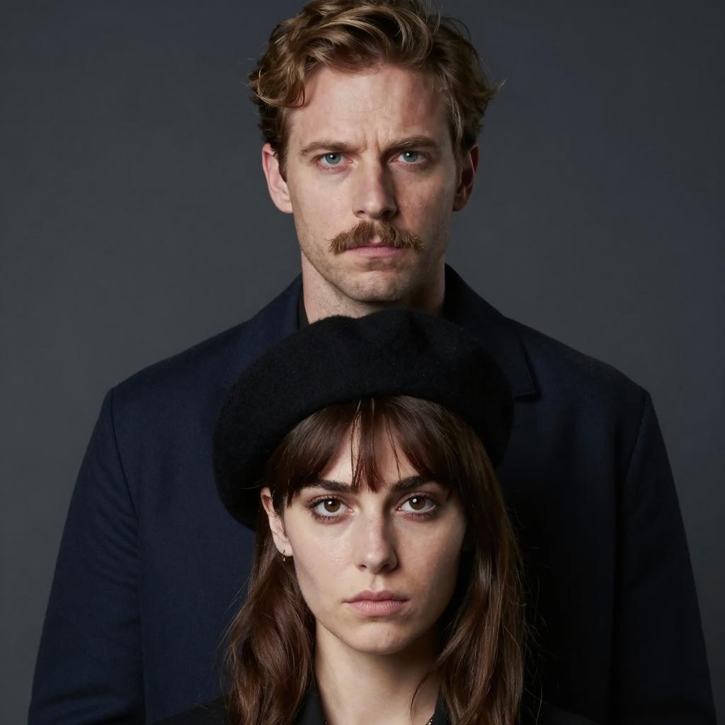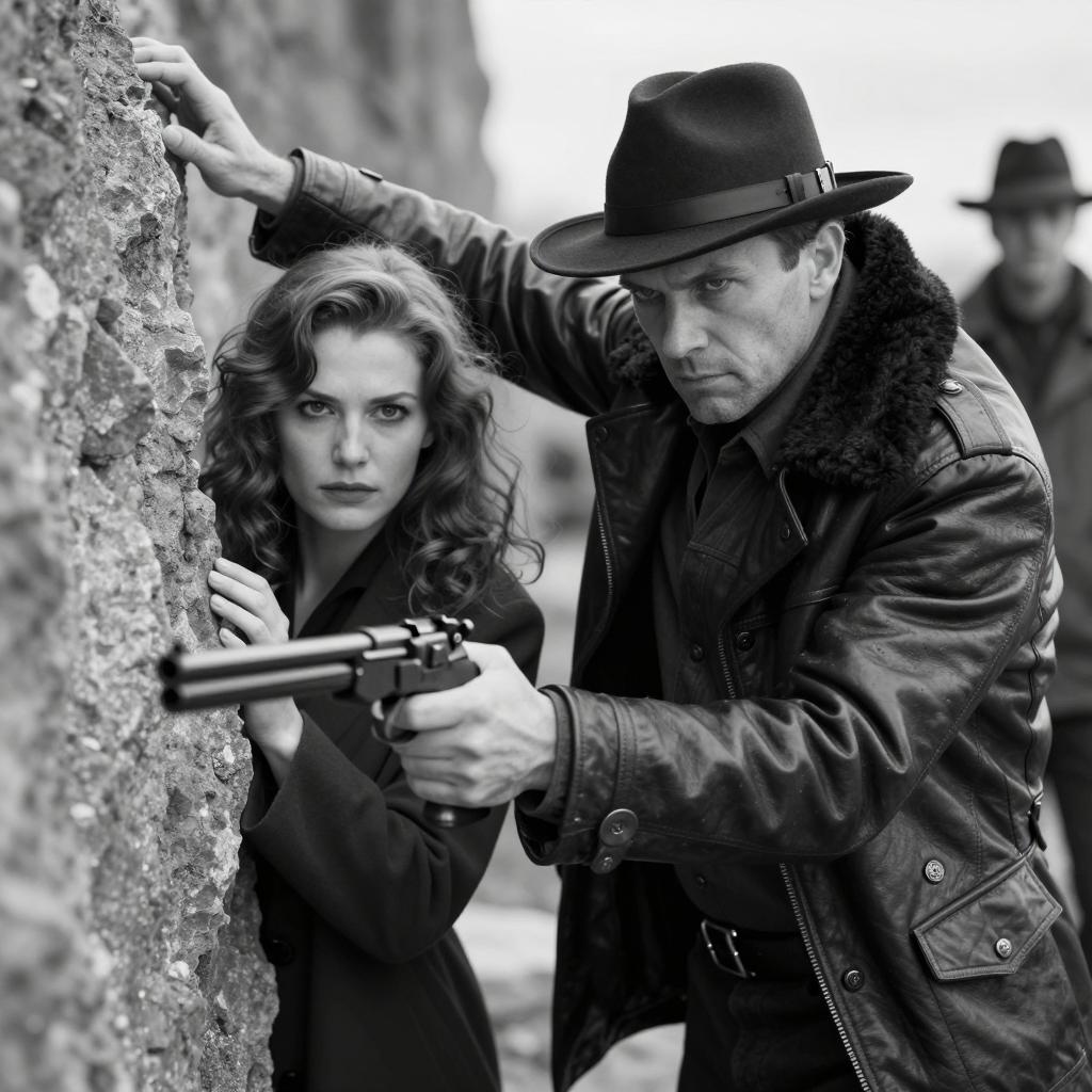 Photograph of a man and woman in close-up. Man on the right, holding a silver revolver in his right hand, has short brown hair, light stubble, and wears a brown coat with a checkered shirt and bow tie. Woman on the left has long brown hair, fair skin, and a serious expression, partially obscured by the man. Background is dark and indistinct.