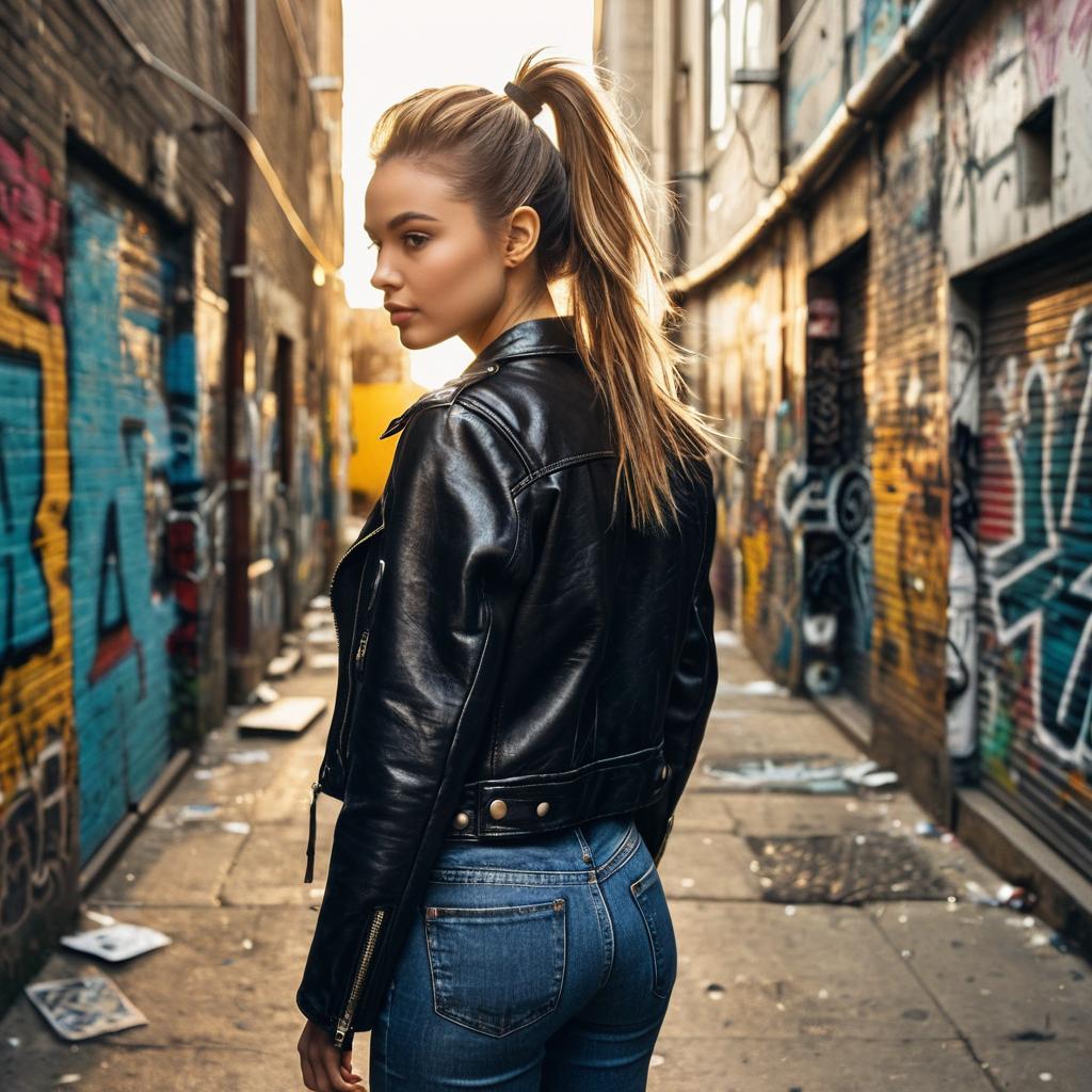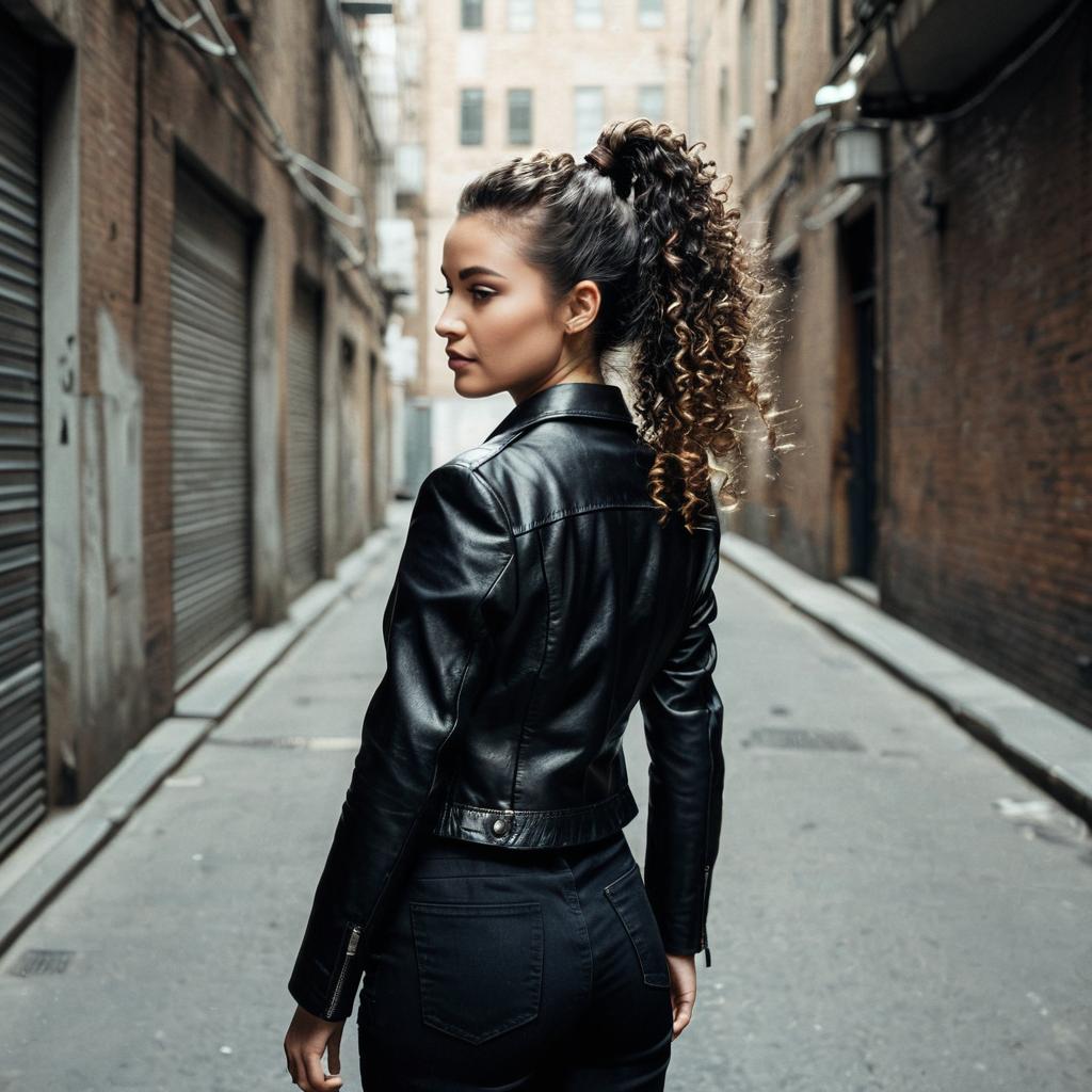 Curly Ponytail hairstyle on woman, wearing tailored leather jacket with silk blouse, in urban alleyway, captured in fashion editorial style with soft diffused daylight.