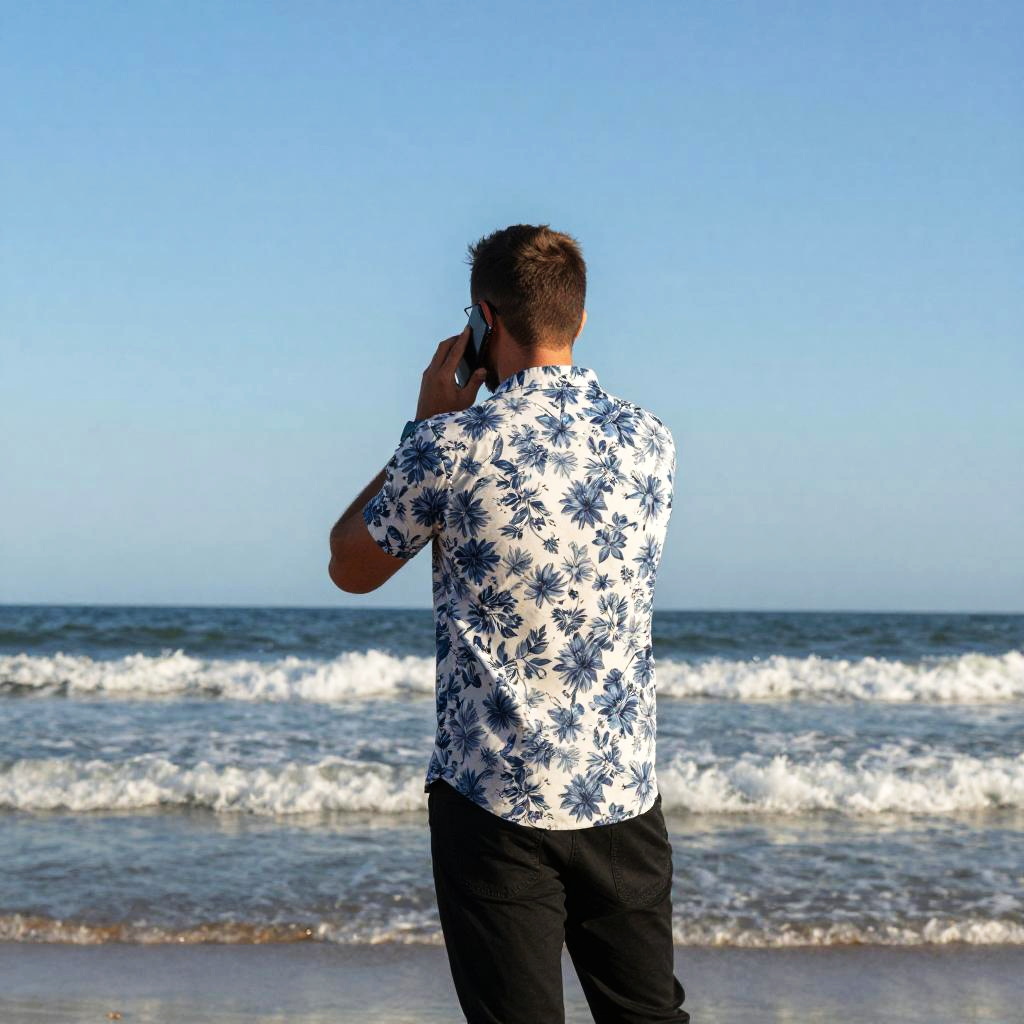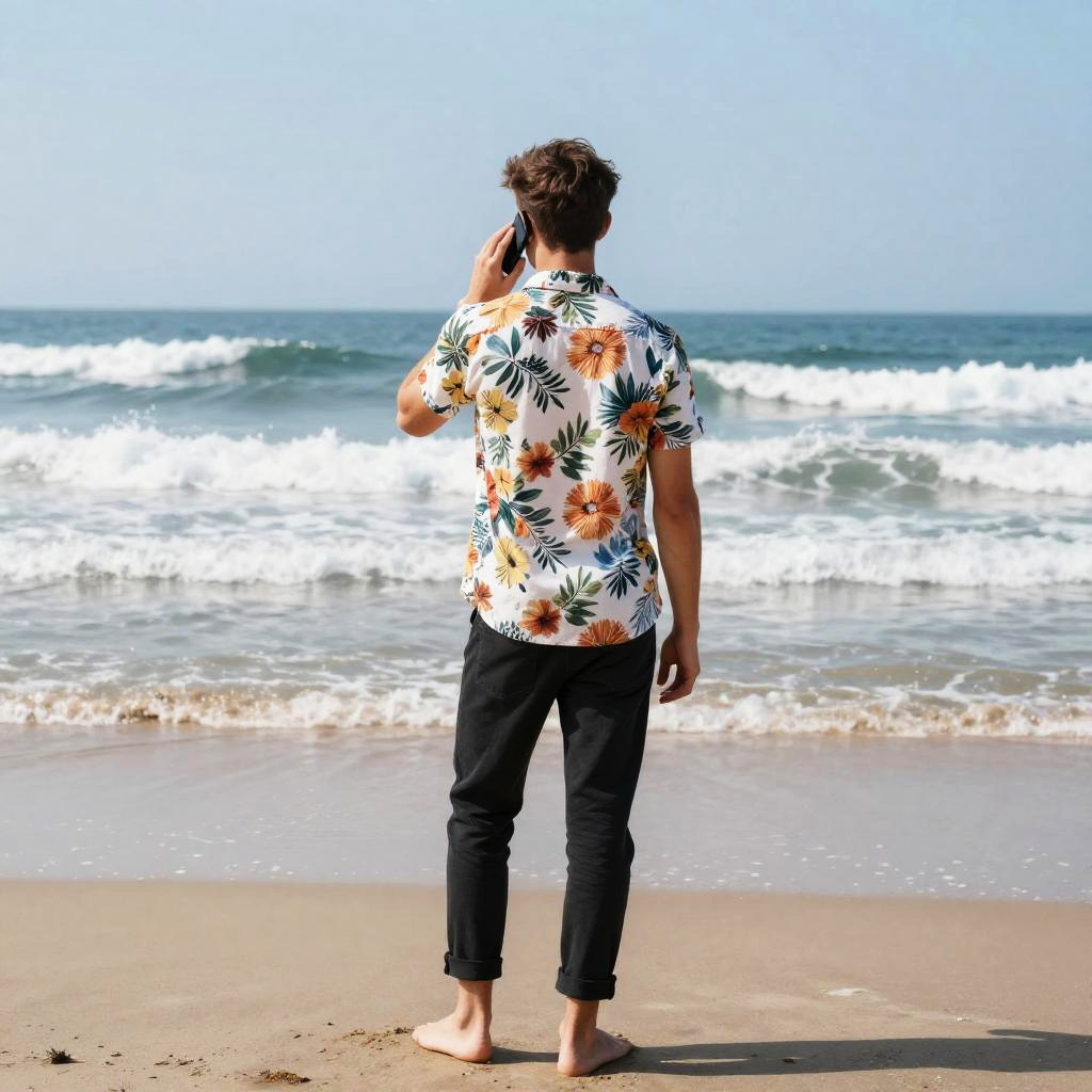 A photograph of a young man standing on a beach, facing away from the camera. He has short brown hair and is wearing a white floral shirt with black pants that are rolled up to his calves. He's holding a phone to his ear with his right hand. The ocean waves are visible in the background under a clear blue sky. The overall lighting is bright and natural.