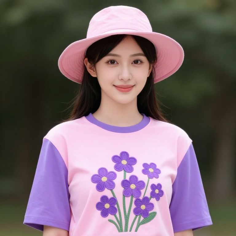 Female, wearing a pink and purple outfit with purple flowers on the front, and a pink hat on her head.
