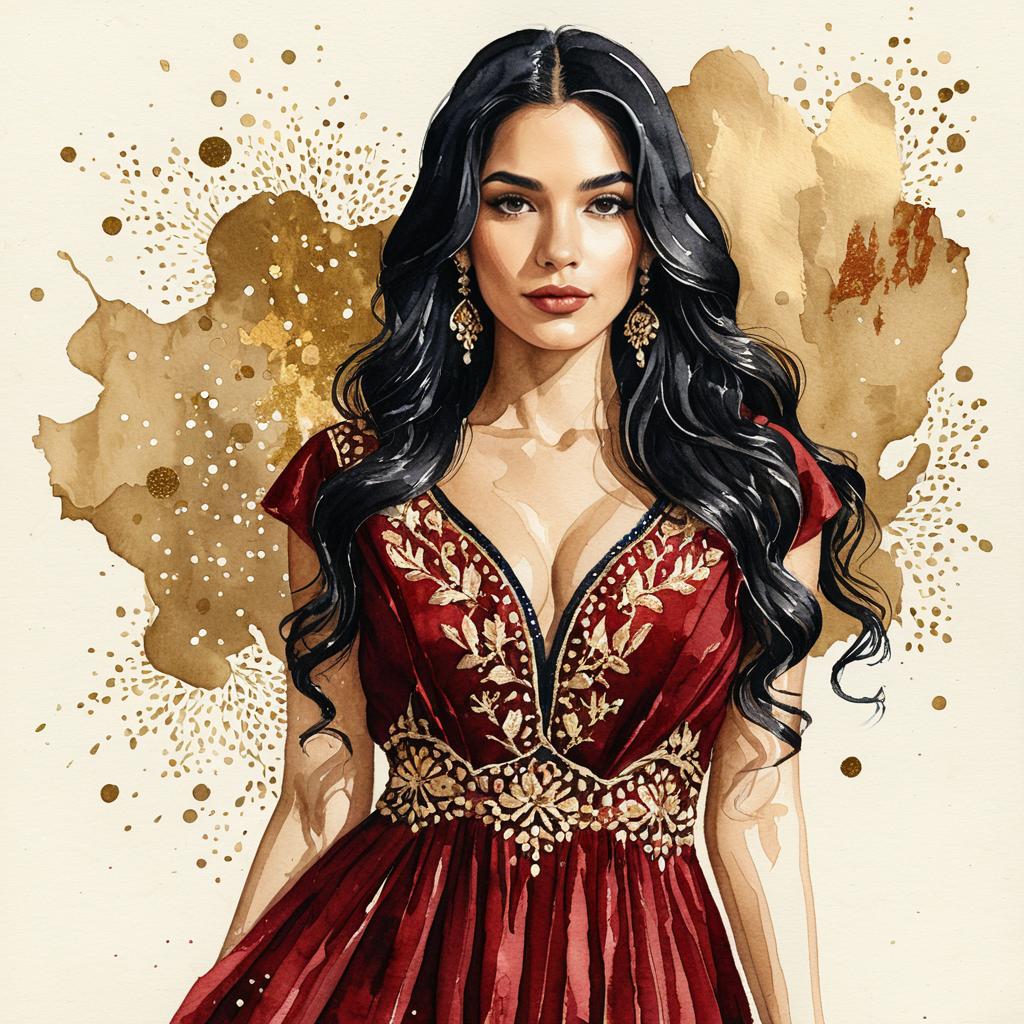 A watercolor illustration of a elegant Middle Eastern woman with long, wavy black hair, wearing an embroidered deep red gown. The background is a textured paper with golden shimmer splashes, giving an elegant, artistic feel