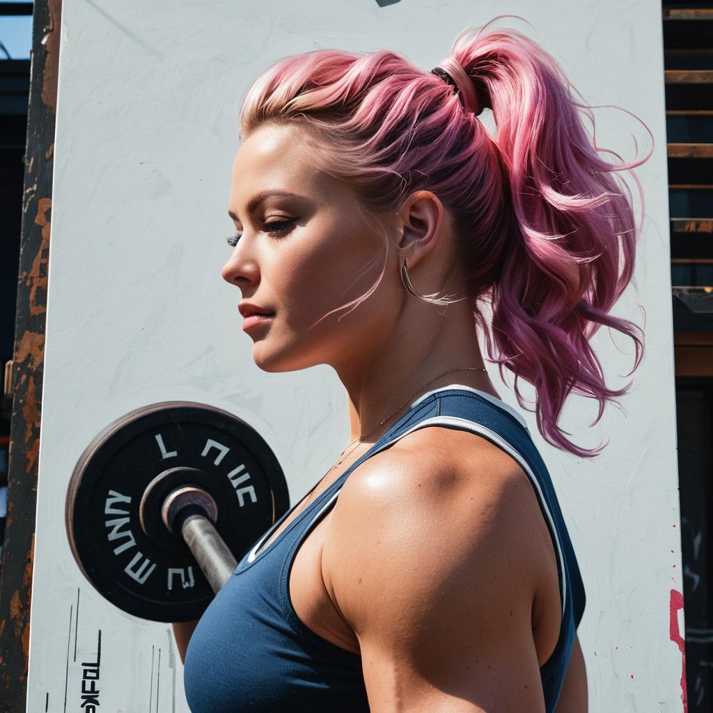 Muscular Woman Weightlifting with Pink Hair Ponytail