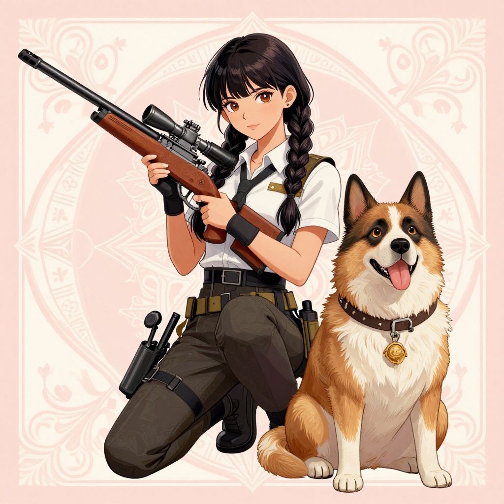 A manga-style illustration features a woman with braids and a sniper rifle, accompanied by a large dog, set against a pastel-colored background with intricate details.